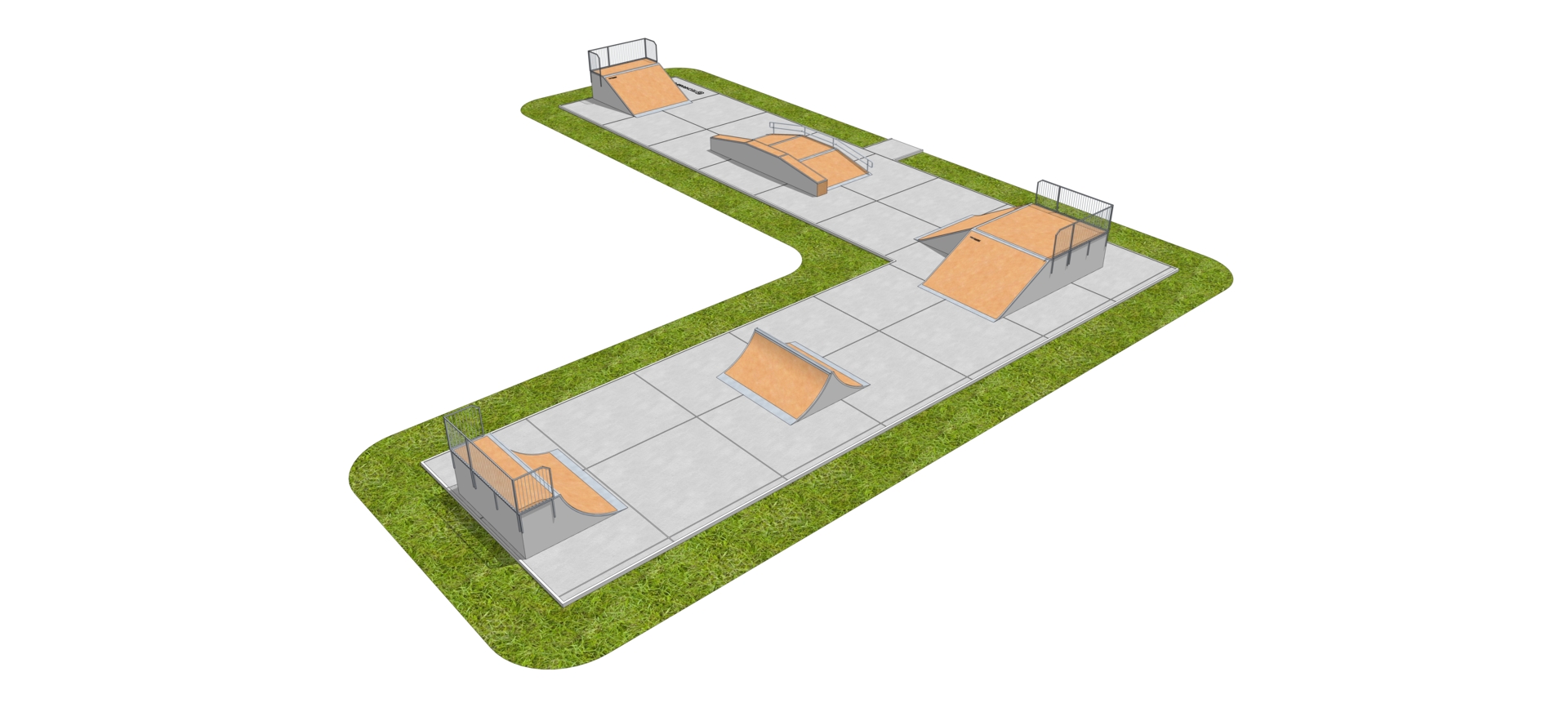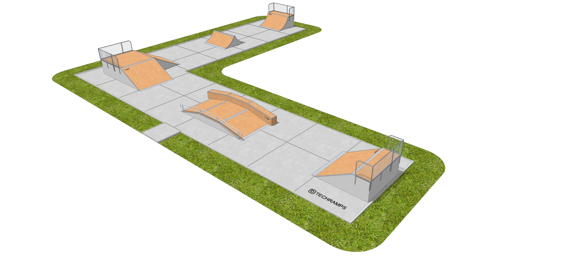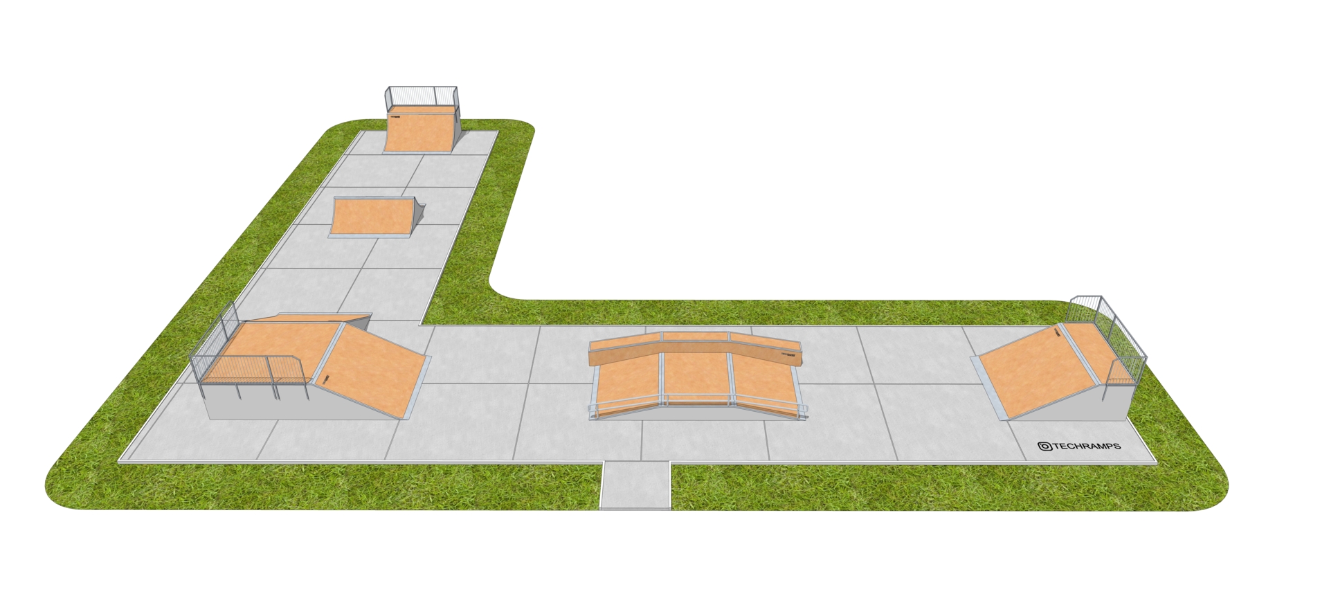 Ett paket med olika ramper och en stor pumptrack som tillfredsställer många användares önskemål, både nybörjare och de mer erfarna åkarna som vill utföra tricks, hopp och volter. Detta skatepaket består av en Pumptrackbana, Ouarter Pipe, Funbox med Hubba och Rail, Bankramp, Grindbench samt en 3 m lång Straight rail. Bank ramp, Quarter Pipe, Funbox och Grindbox är av kraftig, vattentålig plywood med ljuddämpande membran och en speciell yta kallad RampLine, som är underhållsfri, stötdämpande, snabbtorkande, halk- och frostsäker. Straight rail och Grindbench är tillverkade av galvaniserat stål. TÜV-certifierad. Alla ramper och hinder levereras delmonterade.