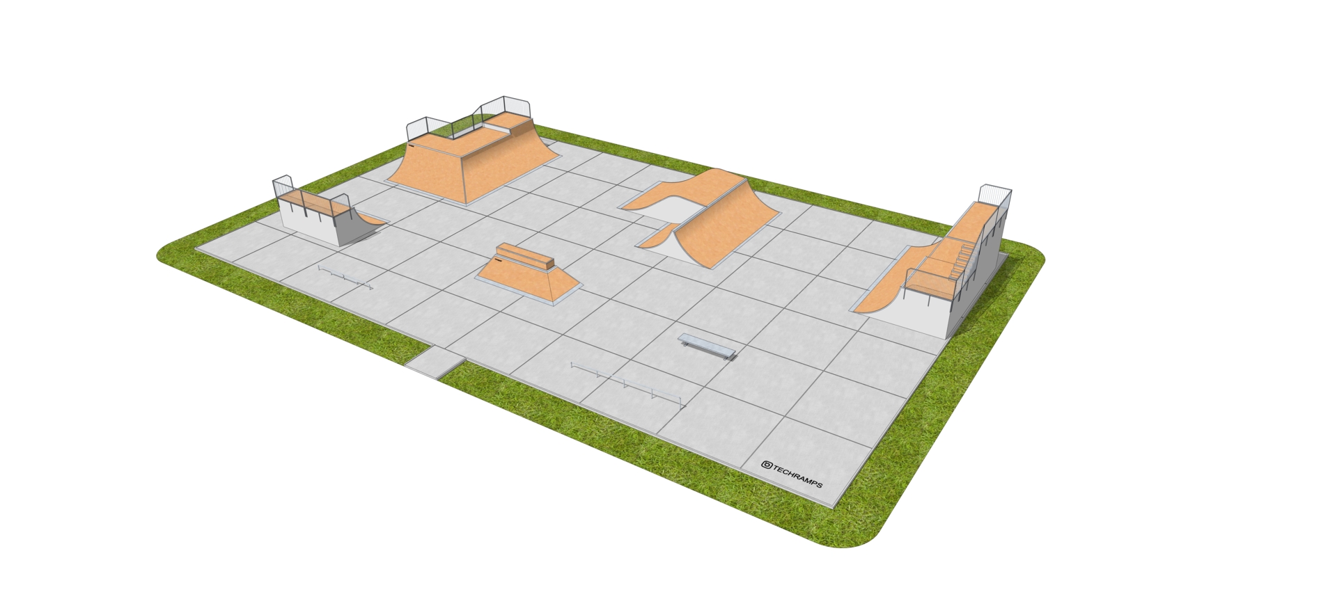 Ett stort och utmanande paket som passar många ungdomar på både skateboard och BMX. Här finns möjlighet att både åka snabbt och utföra tricks, hopp och volter. Detta skatepaket består av 2 Quarter Pipe, Launch ramp, Spine ramp, Quarter Pipe med Wall, Pyramid med Grindbox, Grindbench, Kinked rail, och en 4 m lång Straight rail. Quarter Pipe, Grindbox, Wall och Jumpbox är av kraftig, vattentålig plywood med ljuddämpande membran och en speciell yta kallad RampLine, som är underhållsfri, stötdämpande, snabbtorkande, halk- och frostsäker. Straight rail, Kinked fail och Grindbench är tillverkade av galvaniserat stål. TÜV-certifierad. Alla ramper och hinder levereras delmonterade.