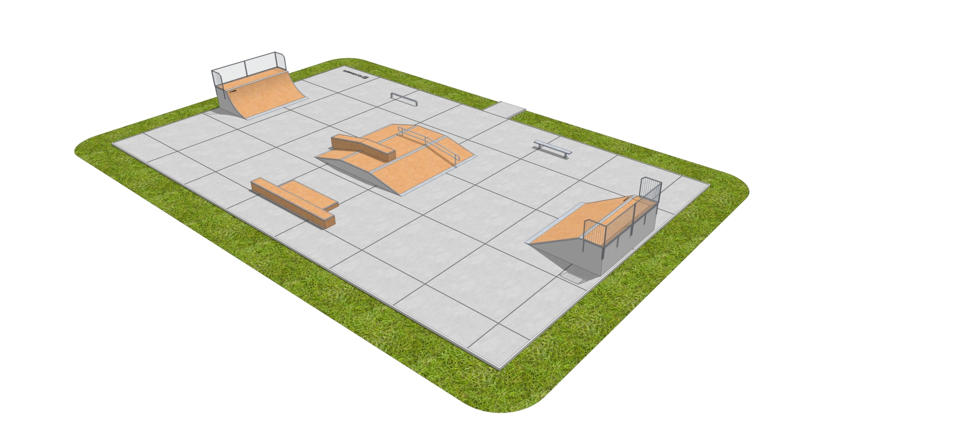 Ett paket med olika ramper och en stor pumptrack som tillfredsställer många användares önskemål, både nybörjare och de mer erfarna åkarna som vill utföra tricks, hopp och volter. Detta skatepaket består av en Pumptrackbana, Ouarter Pipe, Funbox med Hubba och Rail, Bankramp, Grindbench samt en 3 m lång Straight rail. Bank ramp, Quarter Pipe, Funbox och Grindbox är av kraftig, vattentålig plywood med ljuddämpande membran och en speciell yta kallad RampLine, som är underhållsfri, stötdämpande, snabbtorkande, halk- och frostsäker. Straight rail och Grindbench är tillverkade av galvaniserat stål. TÜV-certifierad. Alla ramper och hinder levereras delmonterade.