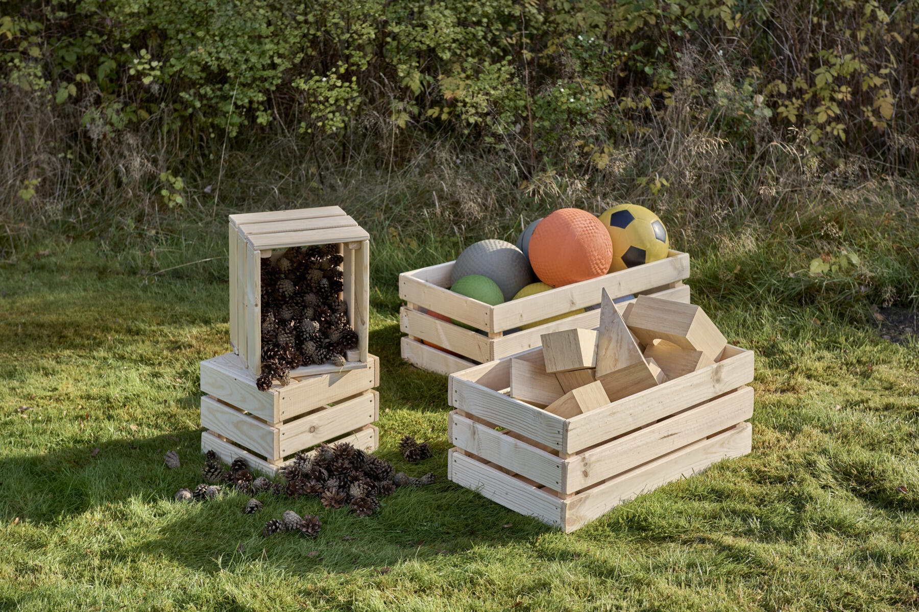 Ett set med fyra funktionella förvaringsbackar som hjälper till att skapa ordning och struktur i förskolans utemiljö. Perfekta för att organisera lek- och naturmaterial, samtidigt som de gör det enkelt för barnen att själva plocka fram och städa undan. Tillverkade av FSC-certifierad furu med oljad yta. Levereras färdigmonterade. Setet innehåller fyra backar med måtten 2 st 31x25x24 cm, 1 st 60x35x24 cm och 1 st 69x39x24 cm.