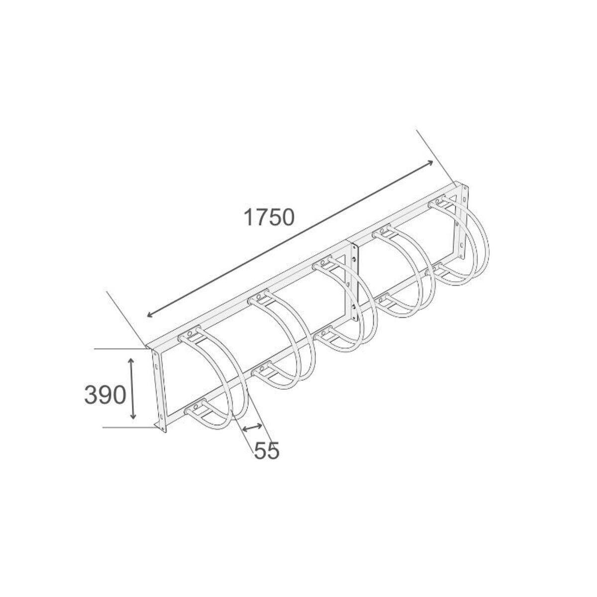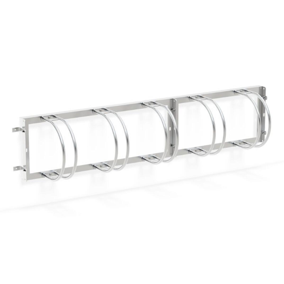 Vägghängt cykelställ för 5 cyklar, passar däckbredd upp till 55 mm. Tillverkat av galvaniserat stål.