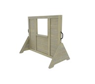 Denna skärmvägg underlättar för att skapa rumslighet i utemiljön. Rumslighet gör att inte hela lekmiljön kan överblickas på en och samma gång, vilket gör den mer spännande att utforska. Fönstret inbjuder till olika typer av fantasi- och rollekar som tex affär, men kan också vara en avskärmad plats om man vill dra sig undan en stund. Levereras färdigmonterat.