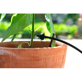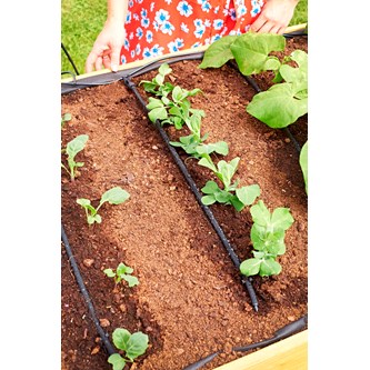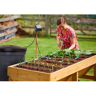 Att odla är en perfekt pedagogisk aktivitet i hållbarhetsarbetet. Med detta system förenklas vardagen och stressen över att växterna ska dö under varma sommardagar. Systemet drivs av solenergi och anpassar bevattningen efter väderförhållandena. Ta vara på det dyrbara regnvattnet och koppla ihop regntunnan med bevattningssystemet för att få ett litet kretslopp som sköter sig självt. Flexibelt och enkelt att bygga ut för att bevattna allt från odlingar i krukor, odlingslådor, pallkragar och trädgårdsland. Skulle vattnet ta slut stängs systemet av automatiskt. Innehåller 30 m slang med 24 droppmunstycken och T-kopplingar, solcellsdriven IDC-enhet med integrerad pump.