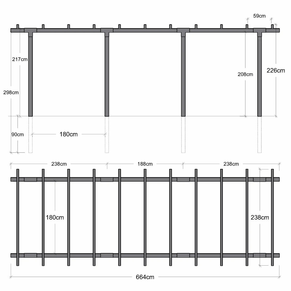 Avlång pergola tillverkad av tryckimpregnerade laminerade och målade trästolpar. Beslagen är av galvaniserat och pulverlackerat stål. Observera att vid ytmontering behöver stolparna sågas av.