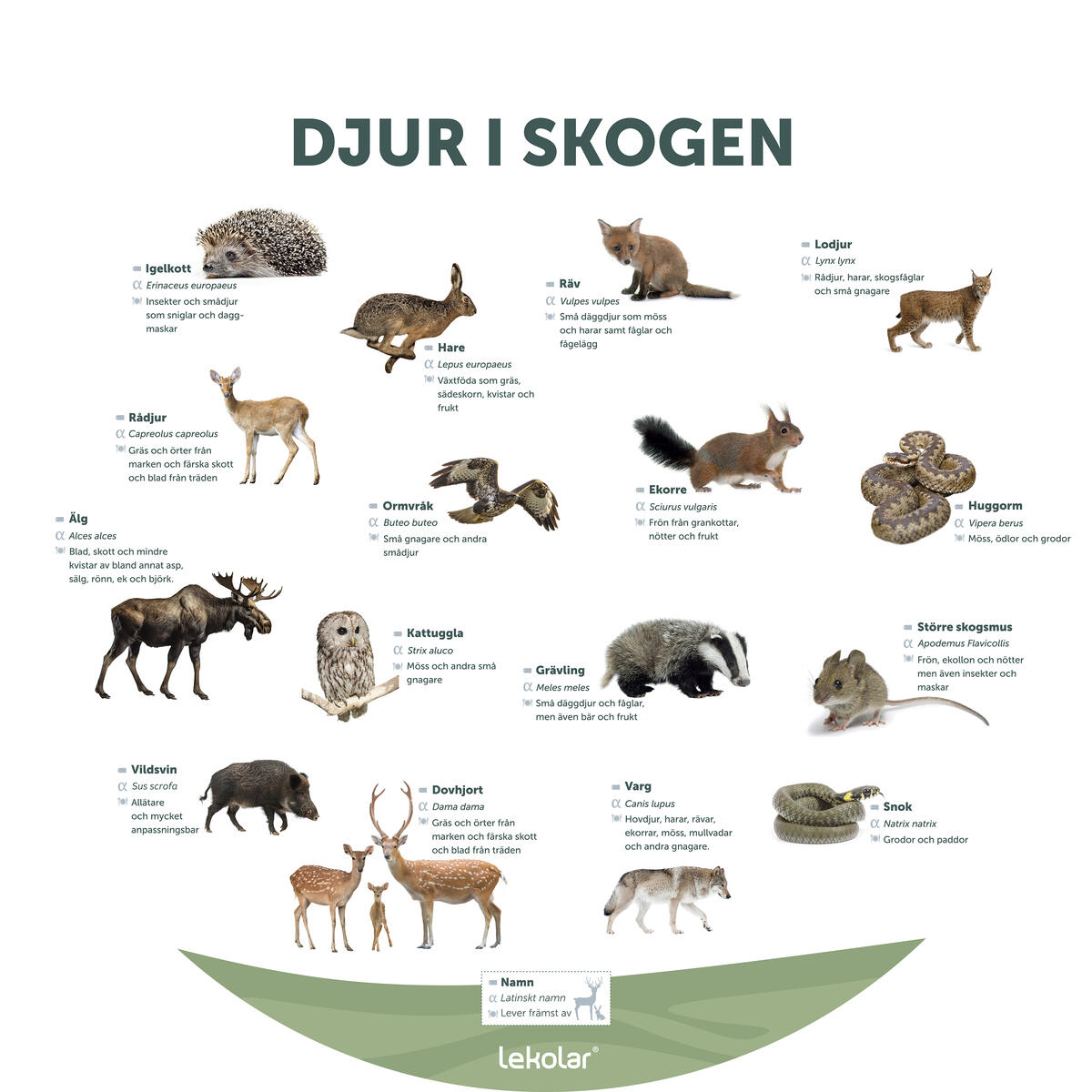 Denna utomhustavla har motiv som visar 16 fotografiska bilder på djur som lever i den svenska skogen. På tavlan finns också fakta som djurets namn, både på svenska och latin, samt vad de främst lever av. Att finna platser i utomhusmiljön där det sker ett växelspel mellan teori och praktik skapar goda förutsättningar för lärande. Tavlan passar bra att hänga på väggar, staket, i uteklassrum och lockar till lärande samtidigt som det gör gården mer attraktiv. Tavlan är mycket robust och grafiken är tryckt på en UV-beständig 3 mm tjock aluminiumplatta. Levereras med förborrade hål för en enkel montering.