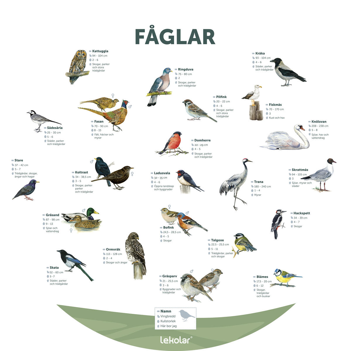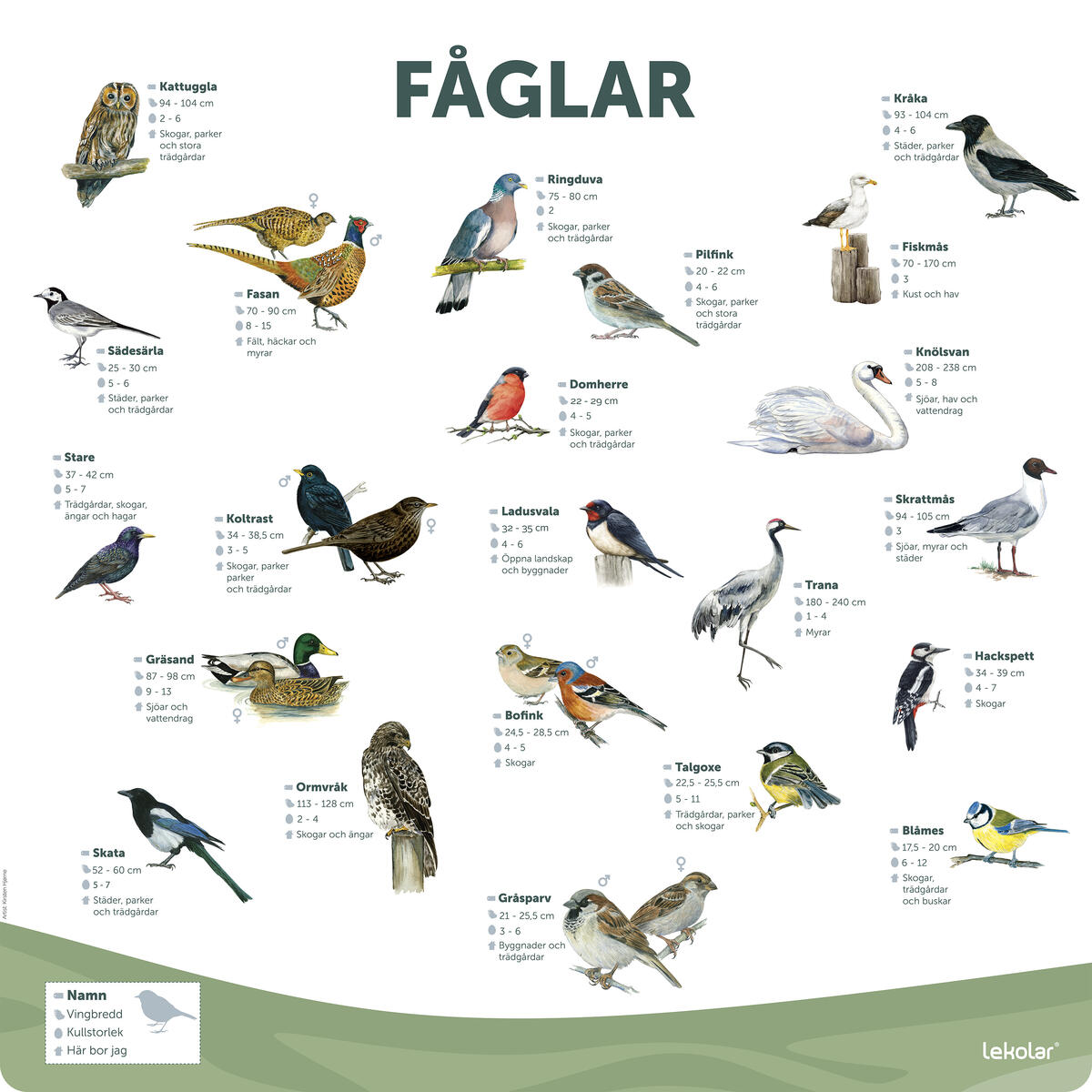 Denna utomhustavla har motiv som visar 22 fotografiska bilder på fåglar som finns i den svenska naturen. På tavlan finns också fakta som djurets namn, vingbredd, kullstorlek och var den lever. Barnen kan med hjälp av sina sinnen lyssna på fågelsången och med hjälp av tavlorna hitta motsvarande fågel och träna på att benämna den korrekt. Att finna platser i utomhusmiljön där det sker ett växelspel mellan teori och praktik skapar goda förutsättningar för lärande. Tavlan passar bra att hänga på väggar, staket, i uteklassrum och lockar till lärande samtidigt som den gör gården mer attraktiv. Tavlan är mycket robust och grafiken är tryckt på en UV-beständig 3 mm tjock aluminiumplatta. Levereras med förborrade hål för en enkel montering.