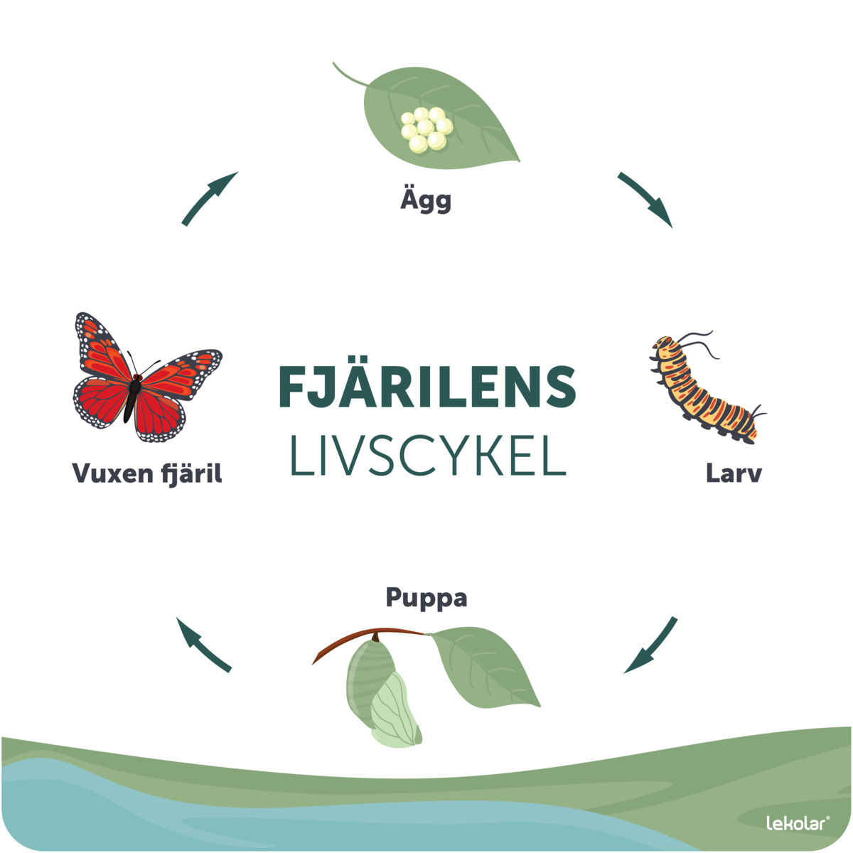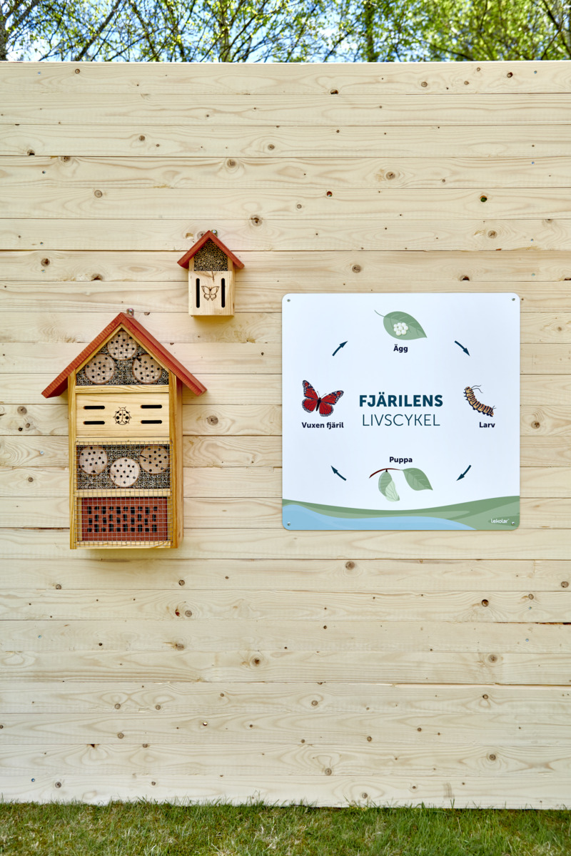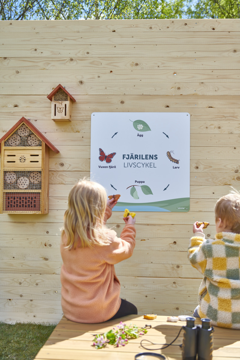 Tavla som hjälper barnen att förstå vägen från ägg, larv, puppa till fullt utvecklad fjäril. Köper ni även till fjärilslarver och föder upp fjärilar får hela förskolan eller skolan följa en av naturens mest fascinerande processer. Att finna aktiviteter i utomhusmiljön där det sker ett växelspel mellan teori och praktik skapar goda förutsättningar för lärande. Tavlan passar bra att hänga på väggar, staket, i uteklassrum och lockar till lärande samtidigt som den gör gården mer attraktiv. Tavlan är mycket robust och grafiken är tryckt på en UV-beständig 3 mm tjock aluminiumplatta. Levereras med förborrade hål för en enkel montering. Mått 70x70 cm.