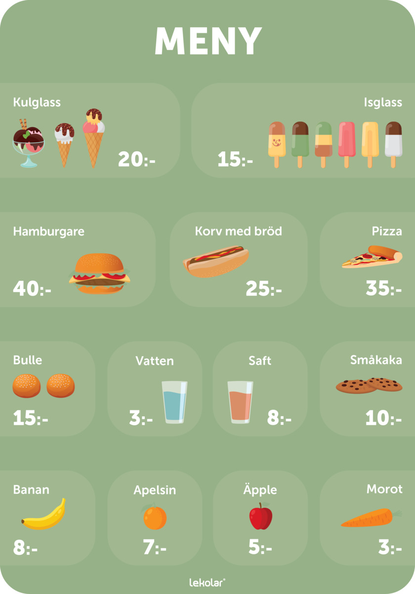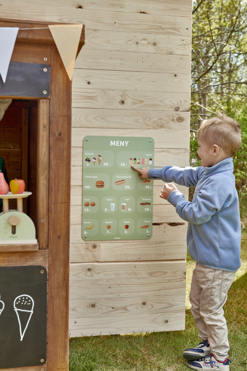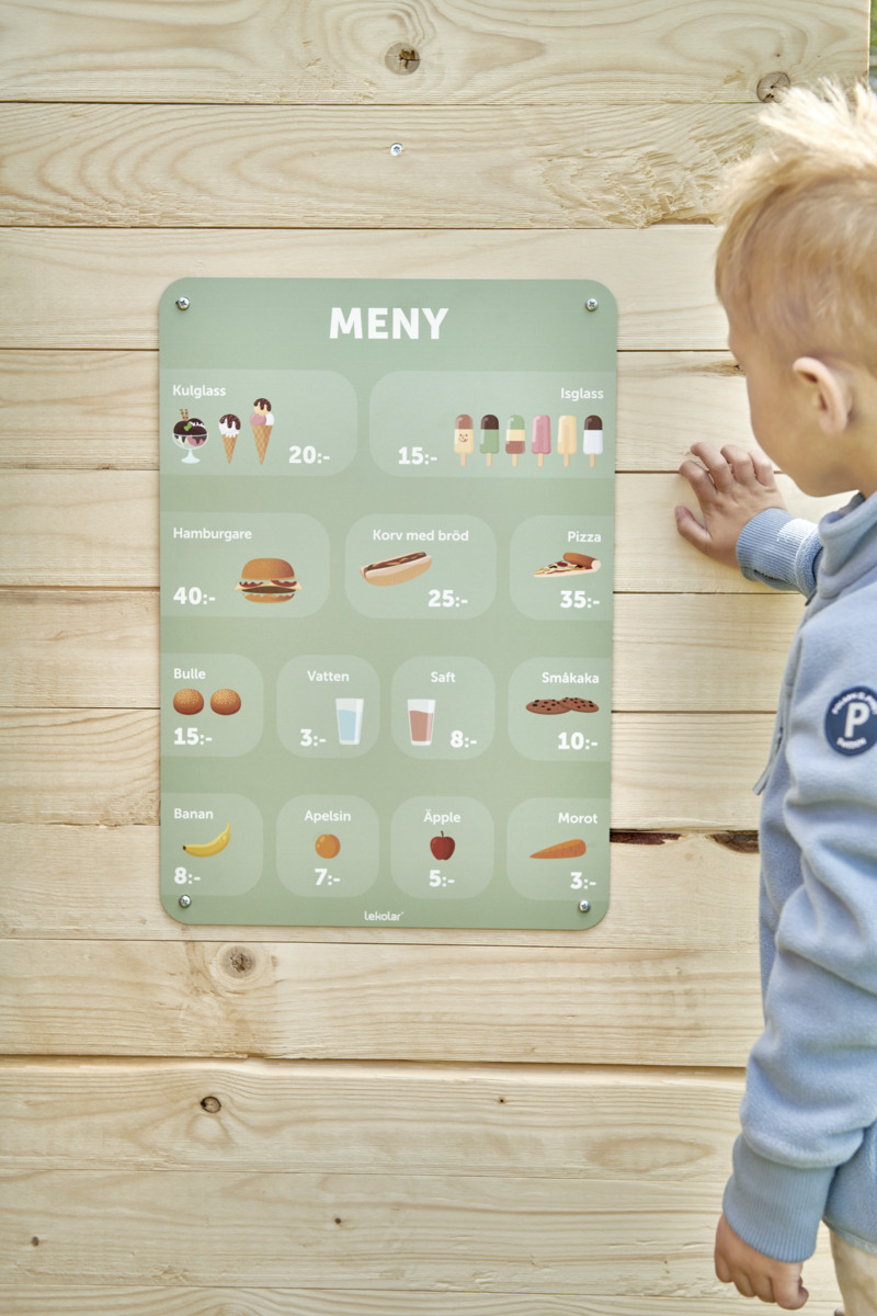 Att leka affär och imitera vardagslivet brukar vara en rollek som uppskattas av många barn. Att få turas om, handla, betala och räkna pengar är en stor del av leken och ger en bra grund för både matematik och sociala färdigheter. Denna meny passar bra att hänga på väggar, lekhus, marknadsstånd, staket i utemiljön och lockar till lärande samtidigt som den gör gården mer attraktiv. Tavlan är mycket robust och grafiken är tryckt på en UV-beständig 3 mm tjock aluminiumplatta. Levereras med förborrade hål för en enkel montering.