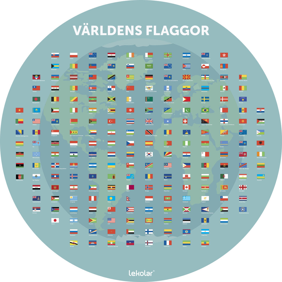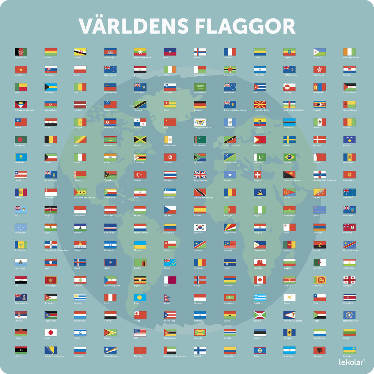 Denna tavla ger en bra överblick över hela världens färgglada flaggor. Vid varje flagga står beskrivet vilket land det är. Tavlan passar bra att hänga på väggar, staket, i uteklassrummet och lockar till lärande samtidigt som det gör skolgården mer inbjudande. Tavlan är mycket robust och grafiken är tryckt på en UV-beständig 3 mm tjock aluminiumplatta. Levereras med förborrade hål för en enkel montering.