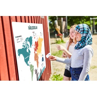Denna utomhustavla har motiv på de 7 världsdelarna indelade i olika färger. Tavlorna passar bra att hänga på väggar, staket, i uteklassrum och lockar till lärande samtidigt som det gör skolgården mer inbjudande. Tavlan är mycket robust och grafiken är tryckt på en UV-beständig 3 mm tjock aluminiumplatta. Levereras med förborrade hål för en enkel montering.