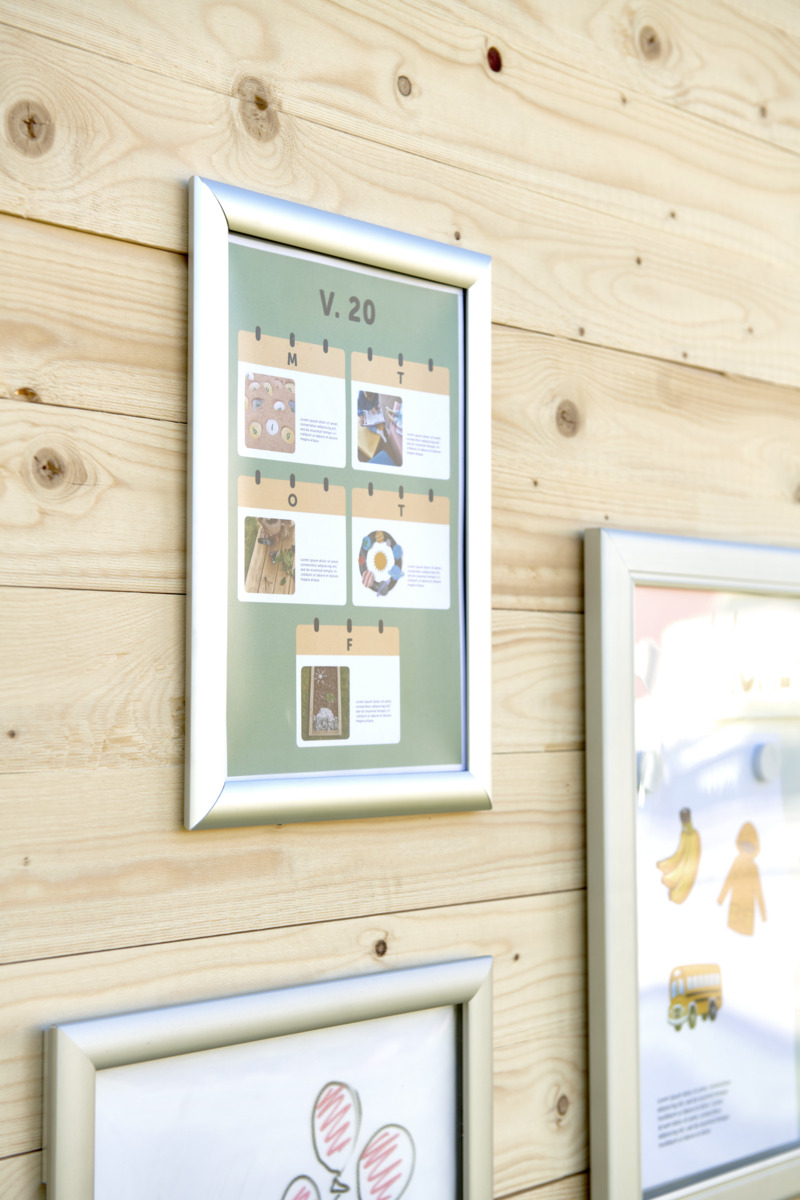 Designad för utomhusbruk och skyddar mot väder och vind samt underlättar för dokumentation och information i utemiljön. Idealiska för att synliggöra barnens arbeten, dela med sig av veckans aktiviteter, tips på hur miljöerna eller lekredskap kan användas, eller för annan viktig information. Skumlister hindrar vatten från att tränga in. Ramens fiffiga snäppfunktion gör att innehållet i ramarna enkelt kan skiftas ut. Levereras med skruvar och pluggar.