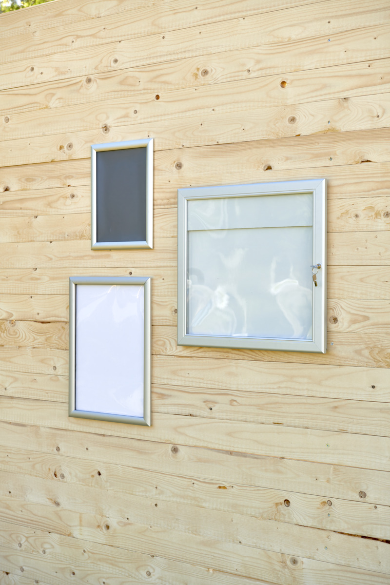 Designad för utomhusbruk och skyddar mot väder och vind samt underlättar för dokumentation och information i utemiljön. Idealiska för att synliggöra barnens arbeten, dela med sig av veckans aktiviteter, tips på hur miljöerna eller lekredskap kan användas, eller för annan viktig information. Skumlister hindrar vatten från att tränga in. Ramens fiffiga snäppfunktion gör att innehållet i ramarna enkelt kan skiftas ut. Kan även monteras med tjockare inlägg och laminerade plakat, upp till 4 mm. Levereras med skruvar och pluggar.