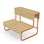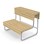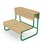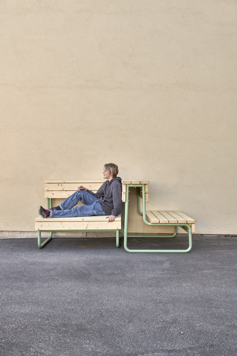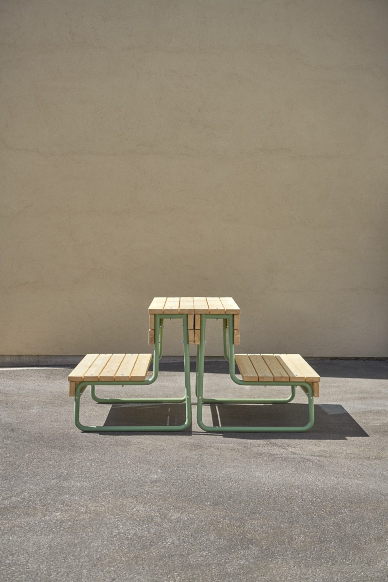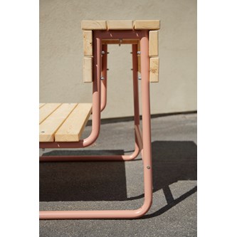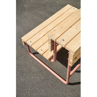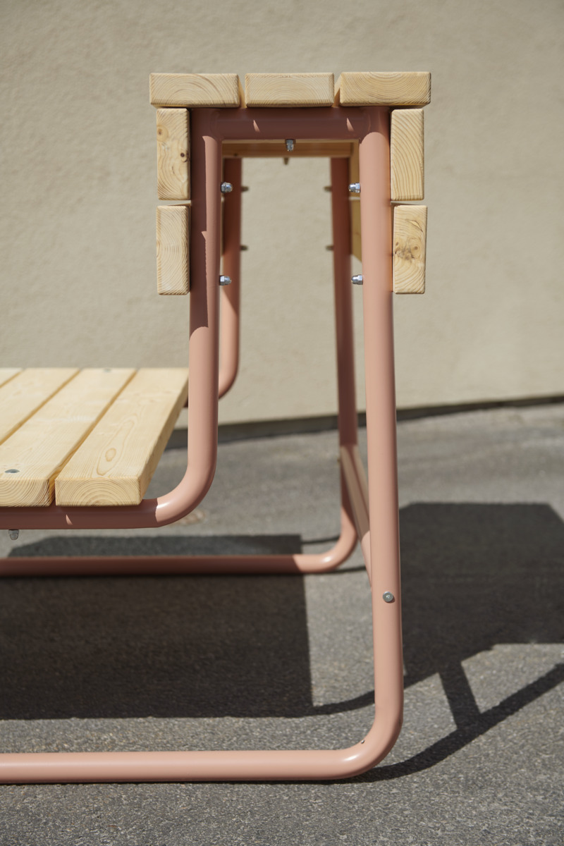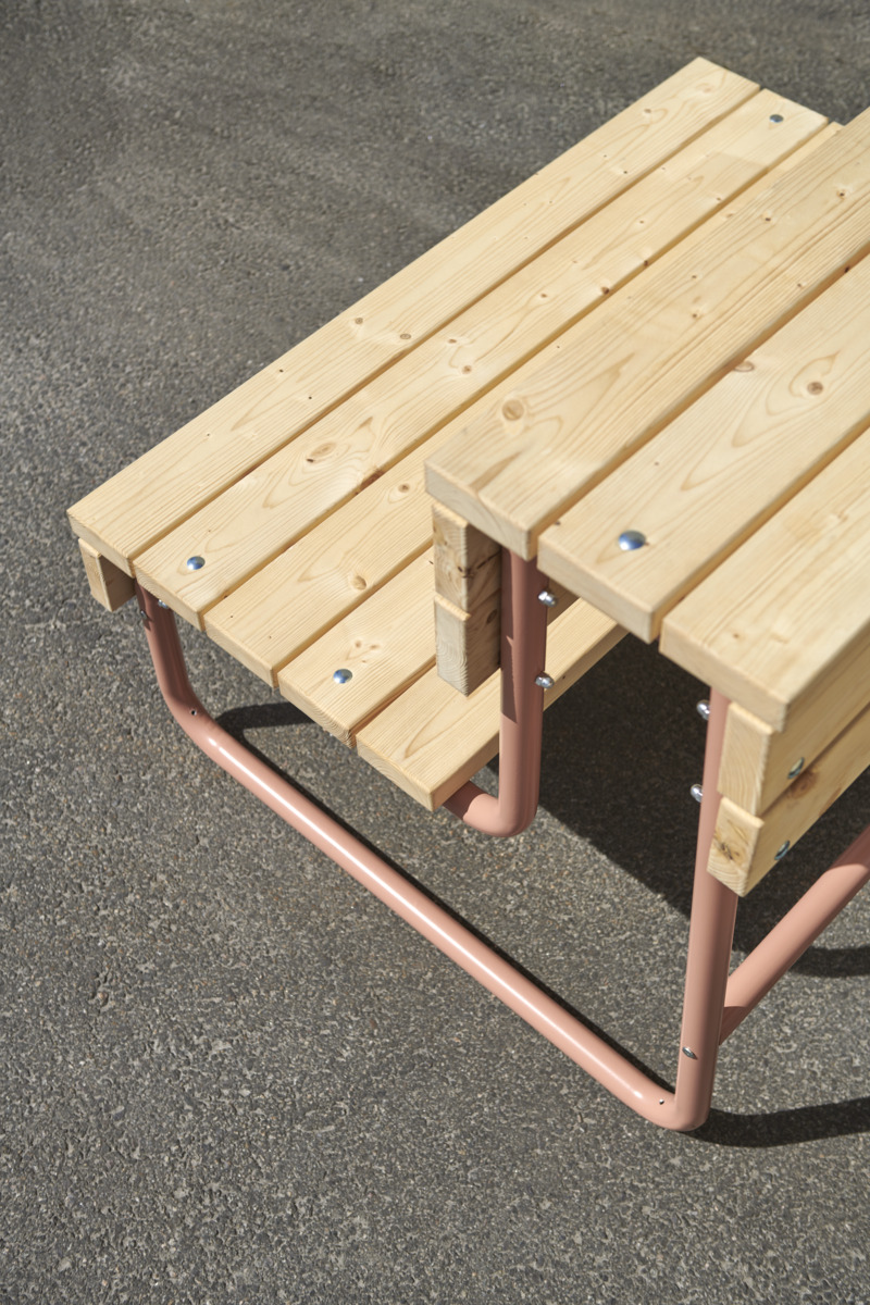 Stålytorna på bänkarna går att få lackerade i fyra olika färger eller enbart förzinkat, de lackerade stålytorna är först förzinkade. Bordsskiva i oljad furu.
