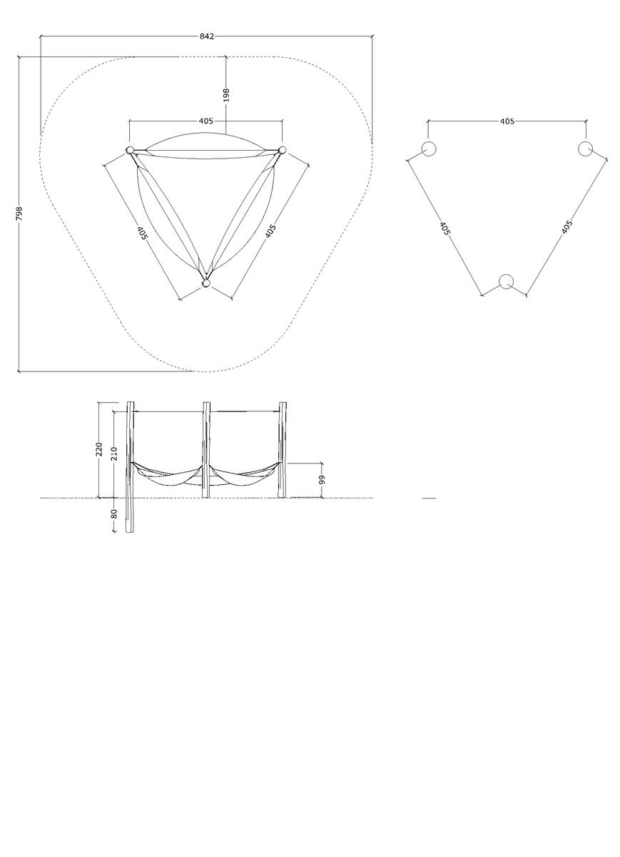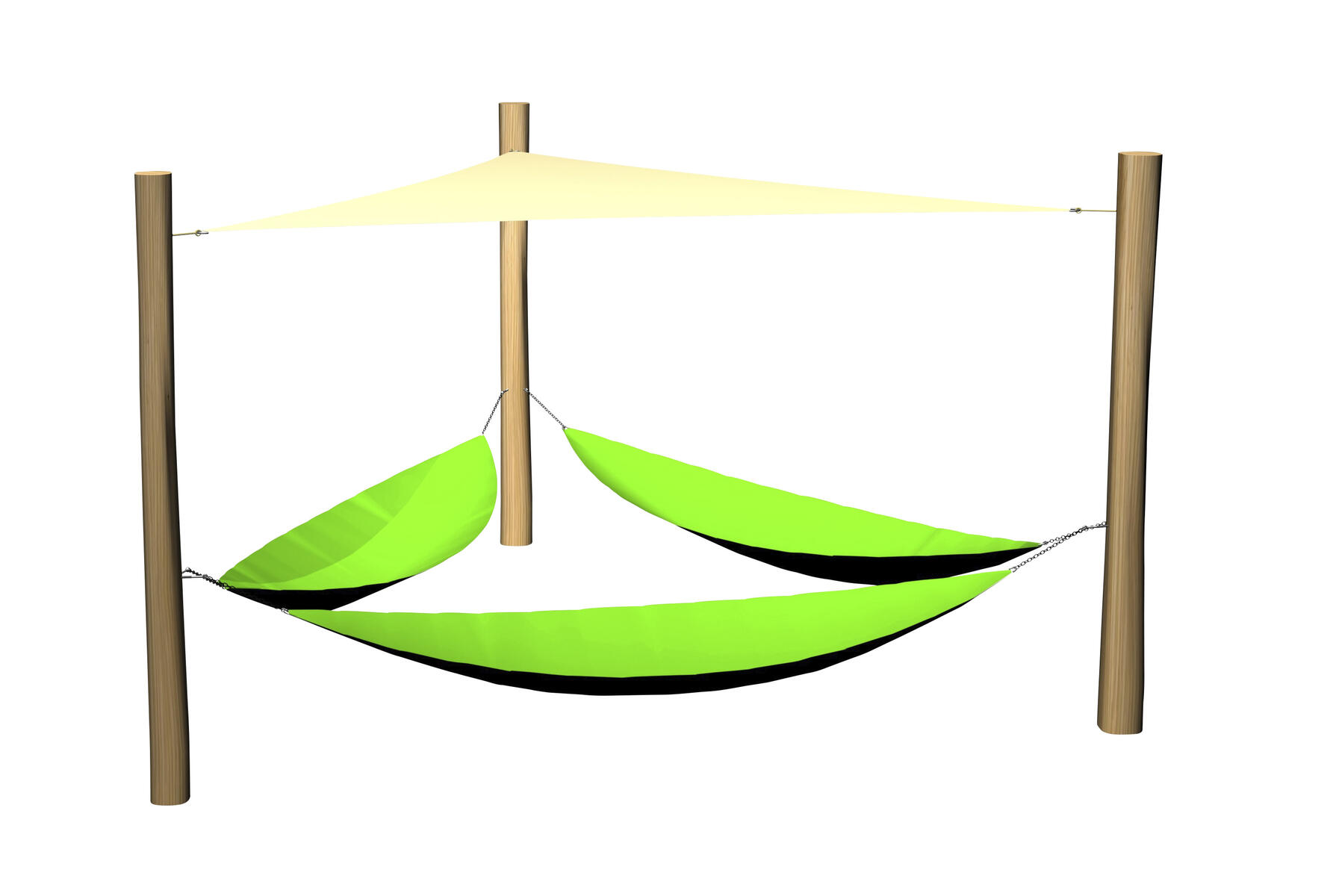 Trippla hängmattor med upphängningssystem och fyra stolpar i obehandlad robinia. Mått hängmattor: 100x290 cm. Vikt 105 kg. Se teknisk ritning för exakta mått för alla delar. Lekolars hängmattor är tillverkade för en person att ligga och slappna av i, de är inte gjorda för lek och bus.