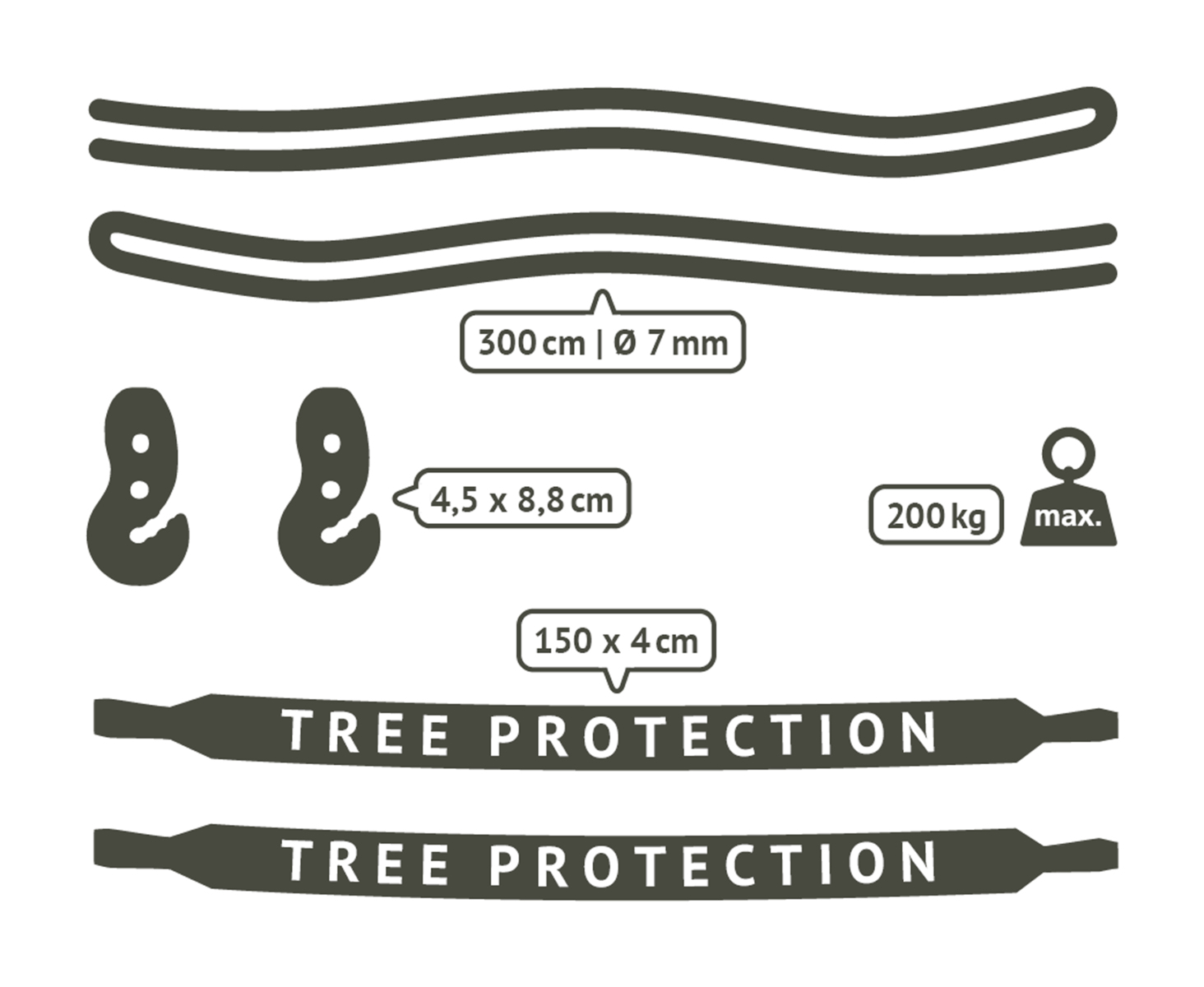 En smart och pålitlig upphängningsmöjlighet från träd, balkar och stolpar. Höjd och längd justeras med hjälp av ett rep. Material: krok polyamid, rep polyester, trädskydd PP. Mått: Rep 300 cm, ø 7 mm, trädskydd 150 cm långt och 4 cm brett. Maxkapacitet: 200 kg.