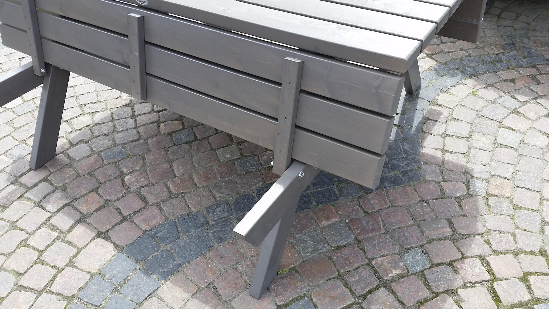 Stort och stabilt med fasta bänkar. Levereras omonterat. Mått: L: 230 cm, sitthöjd 44 cm. Bordsskivans bredd 70,8 cm. Förzinkat underrede. Bordsskiva och bänkar i oljad furu. Vi rekommenderar behandling med vattenbaserad träolja innan användning utomhus. Upprepa behandlingen vid behov.