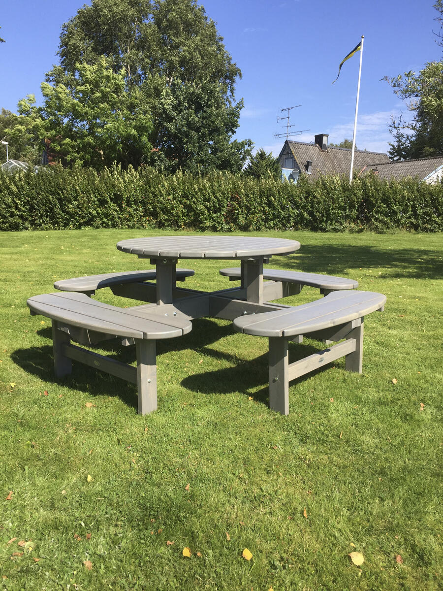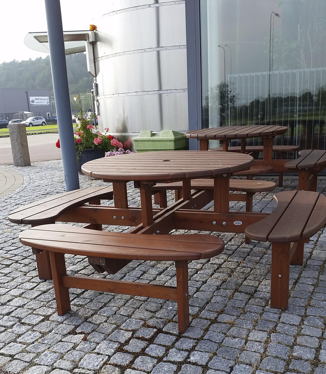 Detta runda bord ger plats för 8 personer och skapar en trevlig mötesplats i utemiljön. Då sitsarna är avdelade blir det enkelt att komma in till bordet och att sätta sig. Varje sits har 2 ben vilket gör sitsarna väldigt stabila, även efter lång användning. Bordet är försett med ett hål för parasoll som har en diameter på 50 mm. Tillverkad av FSC ®-märkt norrländsk furu, 33mm. Levereras omonterat. För bästa hållbarhet rekommenderar vi att den oljade varianten oljas in regelbundet, ni finner våra skötselråd på vår webb.