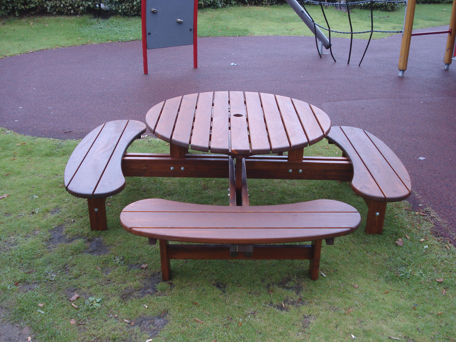 Ett tillgänglighetsanpassat picknickbord helt i trä som passar utmärkt till skolbarn och vuna och skapar en trevlig mötesplats i utemiljön. Detta runda bänkbord ger plats för 2 rullstolsburna och med sitsar ytterligare 4 personer. Då sitsarna är avdelade blir det enkelt att komma in till bordet och att sätta sig. Varje sits har 2 ben vilket gör sitsarna väldigt stabila, även efter lång användning. Bordet är försett med ett hål för parasoll som har en diameter på 50 mm. Tillverkad av FSC ®-märkt norrländsk furu, 40 mm. För bästa hållbarhet rekommenderar vi att den oljade varianten oljas in regelbundet, ni finner våra skötselråd på vår webb.