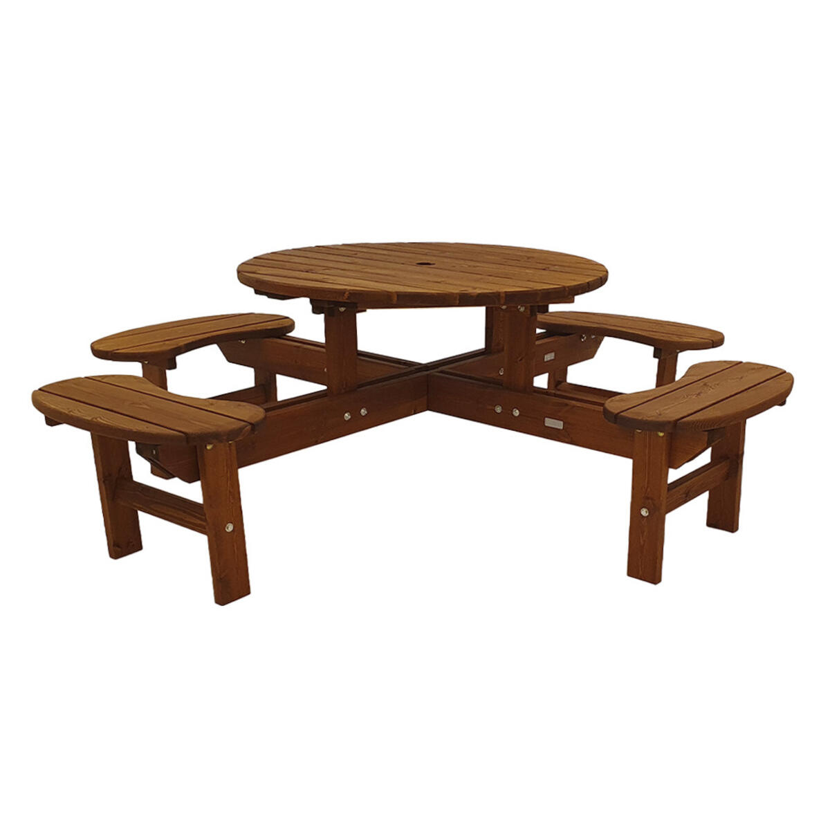 Detta runda bord ger plats för 8 personer och skapar en trevlig mötesplats i utemiljön. Då sitsarna är avdelade blir det enkelt att komma in till bordet och att sätta sig. Varje sits har 2 ben vilket gör sitsarna väldigt stabila, även efter lång användning. Bordet är försett med ett hål för parasoll som har en diameter på 50 mm. Tillverkad av FSC ®-märkt norrländsk furu, 33mm. Levereras omonterat. För bästa hållbarhet rekommenderar vi att den oljade varianten oljas in regelbundet, ni finner våra skötselråd på vår webb.