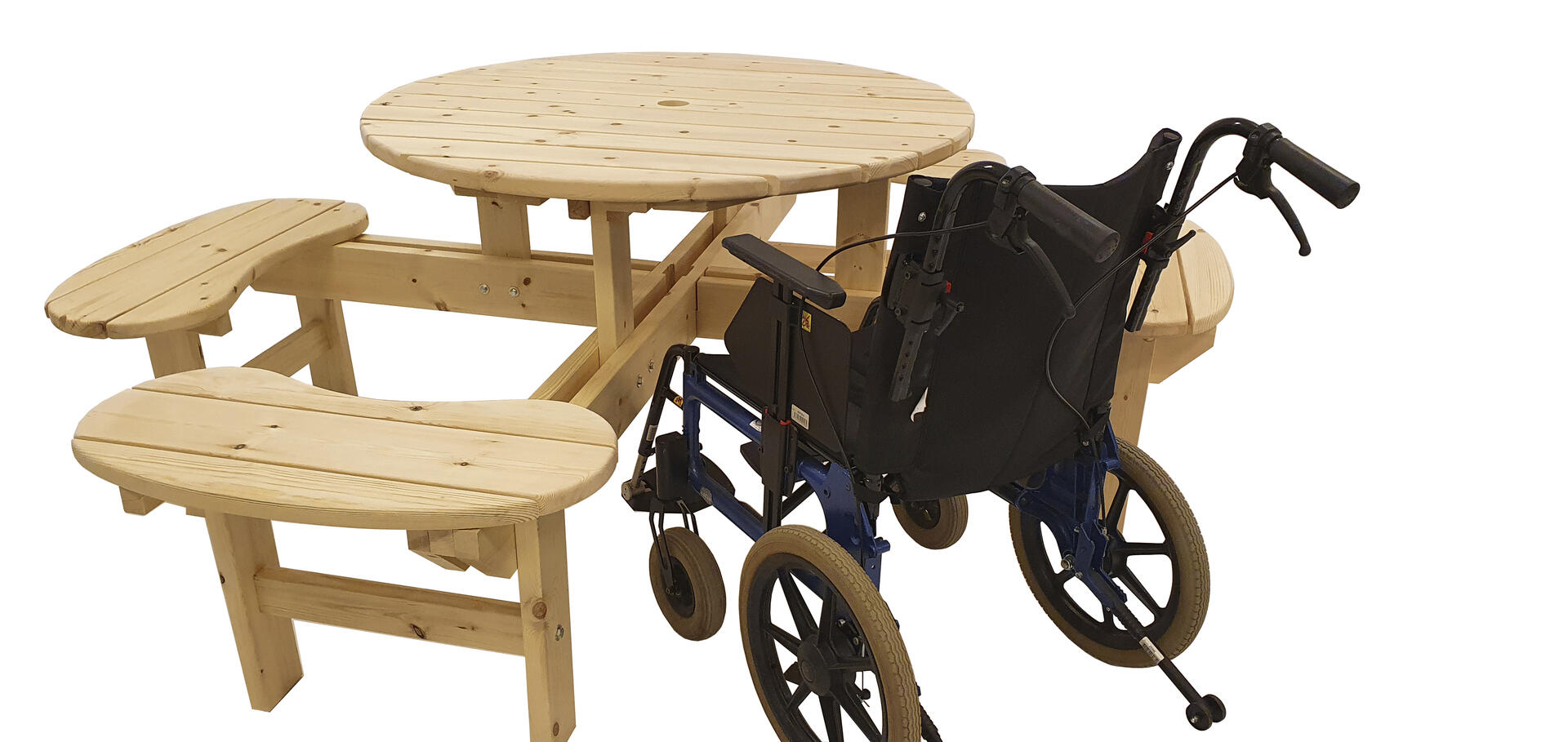 Ett tillgänglighetsanpassat picknickbord helt i trä som passar utmärkt till skolbarn och vuna och skapar en trevlig mötesplats i utemiljön. Detta runda bänkbord ger plats för 2 rullstolsburna och med sitsar ytterligare 4 personer. Då sitsarna är avdelade blir det enkelt att komma in till bordet och att sätta sig. Varje sits har 2 ben vilket gör sitsarna väldigt stabila, även efter lång användning. Bordet är försett med ett hål för parasoll som har en diameter på 50 mm. Tillverkad av FSC ®-märkt norrländsk furu, 40 mm. För bästa hållbarhet rekommenderar vi att den oljade varianten oljas in regelbundet, ni finner våra skötselråd på vår webb.