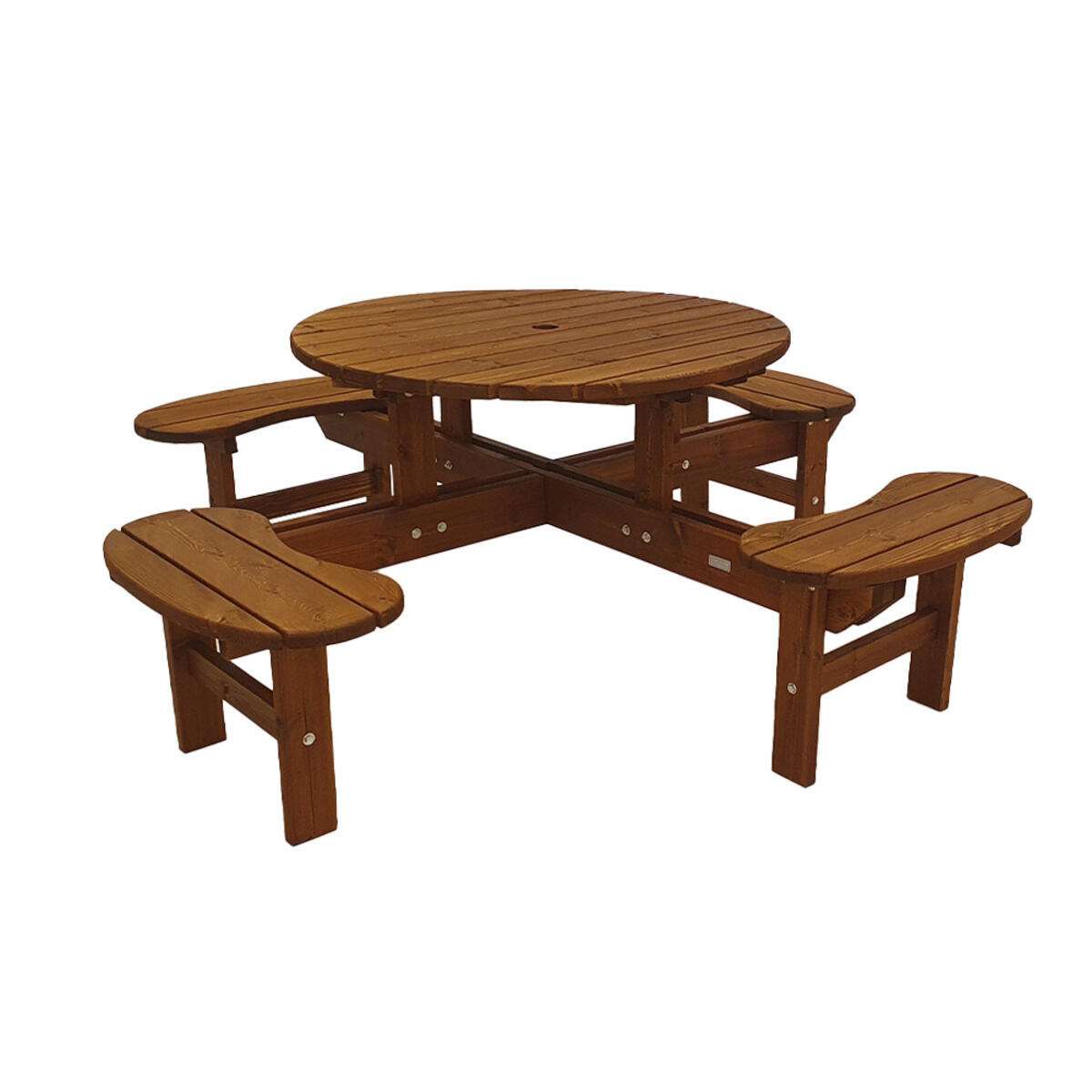 Detta runda bord ger plats för 8 personer och skapar en trevlig mötesplats mellan barn och vuna i utemiljön. Då sitsarna är avdelade blir det enkelt att komma in till bordet och att sätta sig. Varje sits har 2 ben vilket gör sitsarna väldigt stabila, även efter lång användning. Bordet är försett med ett hål för parasoll som har en diameter på 50 mm. Tillverkad av FSC ®-märkt norrländsk furu, 33mm. Levereras omonterat. För bästa hållbarhet rekommenderar vi att den oljade varianten oljas in regelbundet, ni finner våra skötselråd på vår webb.