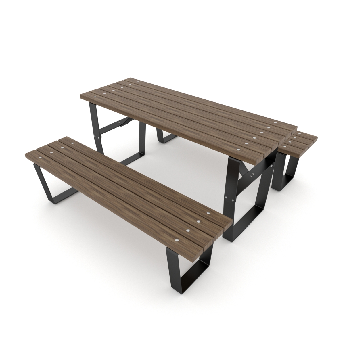 Stålytorna på bänkarna går att få lackerade i fyra olika färger eller enbart förzinkat, de lackerade stålytorna är först förzinkade. Bordsskiva i oljad furu.