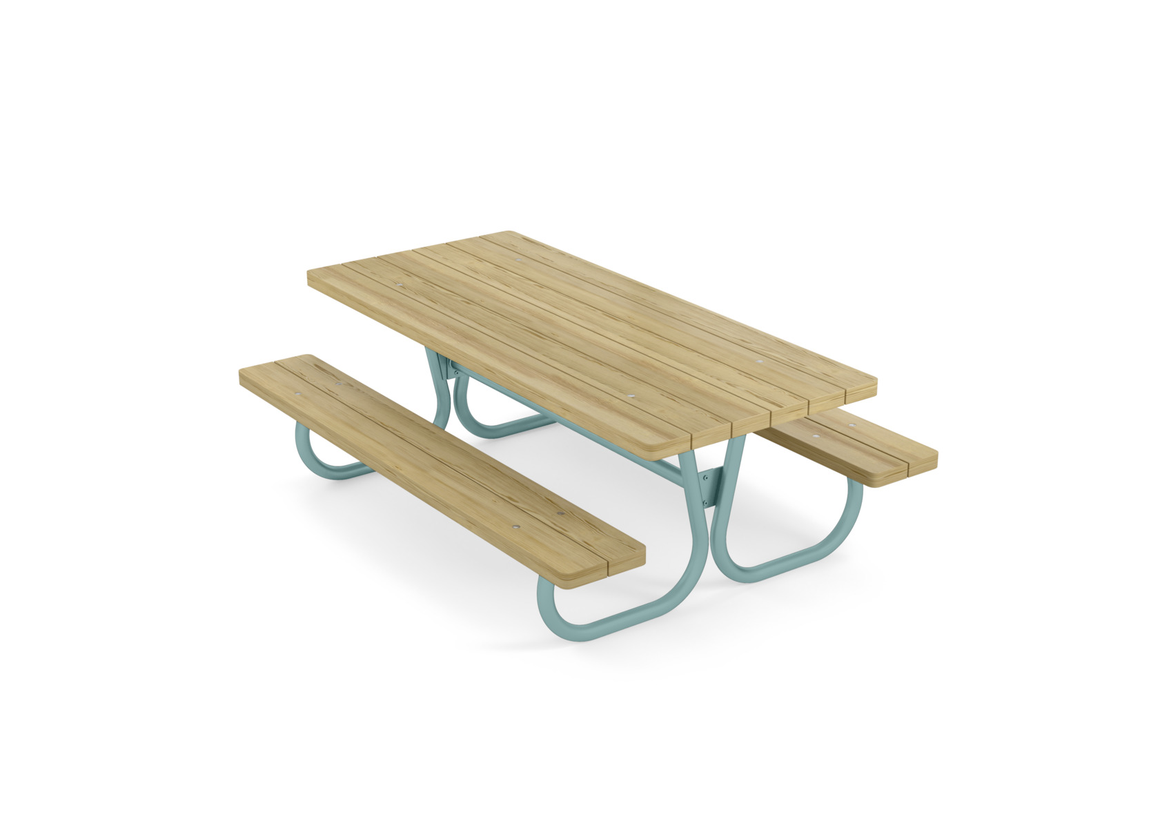 Stålytorna på bänkarna går att få lackerade i fyra olika färger eller enbart förzinkat, de lackerade stålytorna är först förzinkade. Bordsskiva i oljad furu.