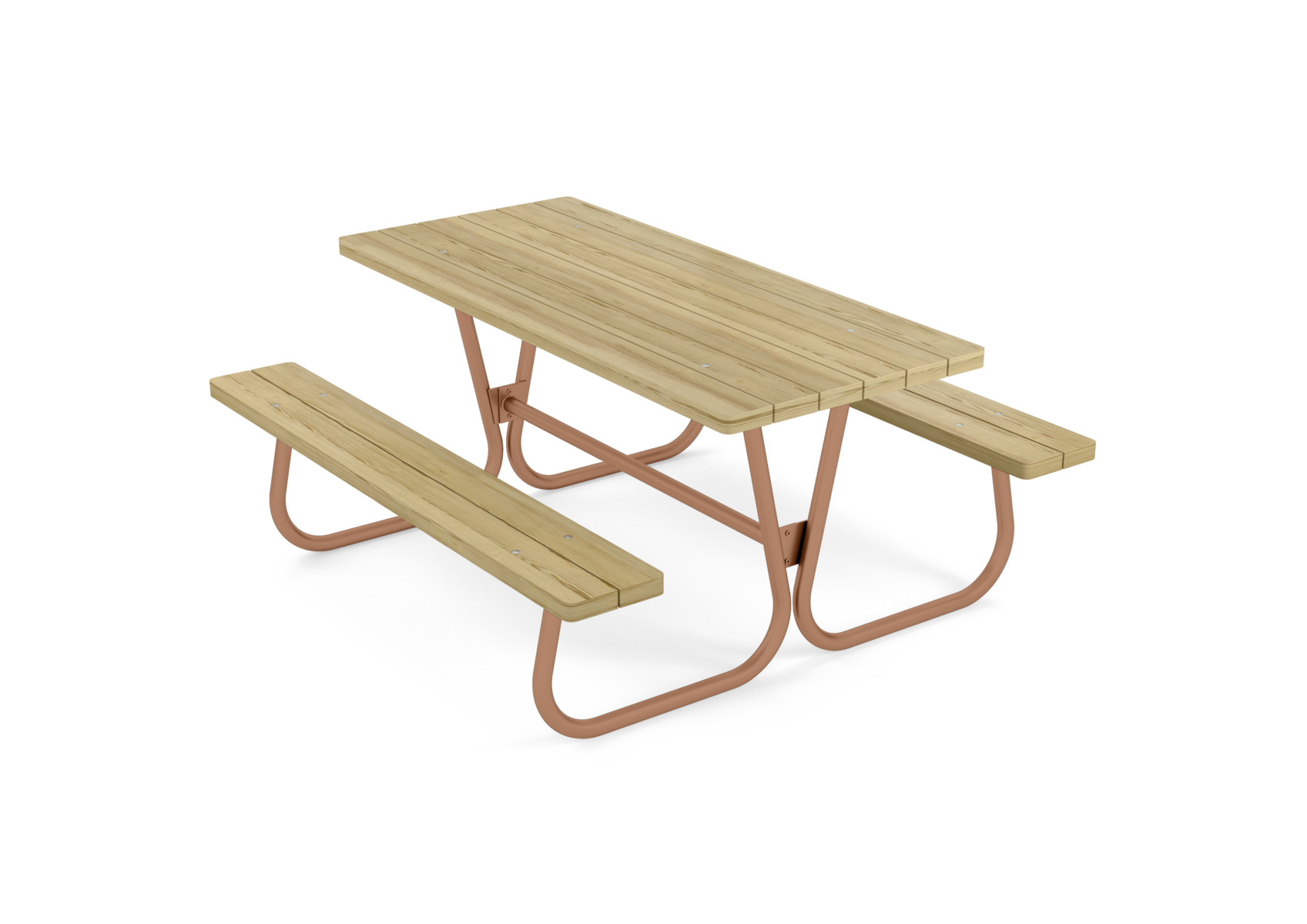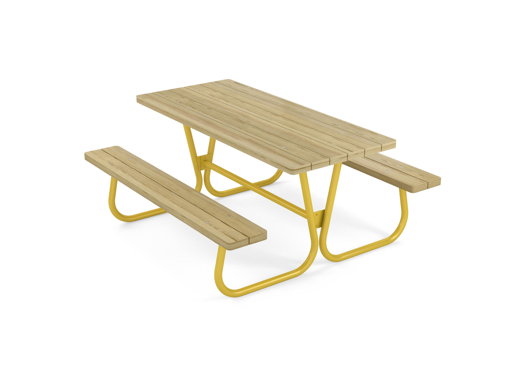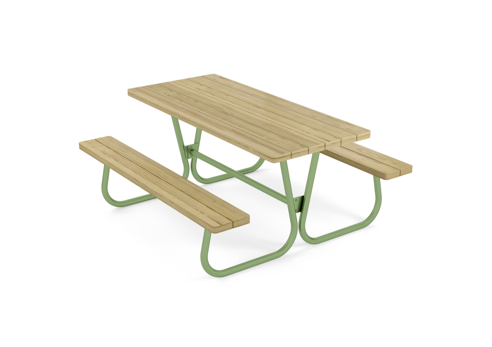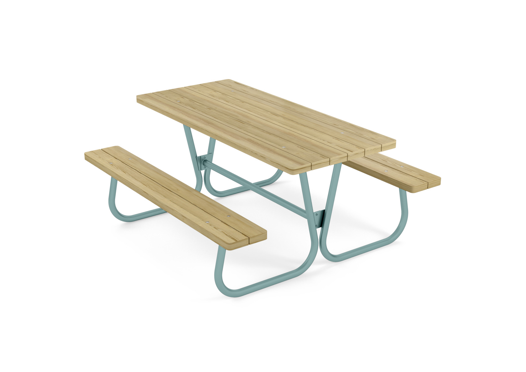 Stålytorna på bänkarna går att få lackerade i fyra olika färger eller enbart förzinkat, de lackerade stålytorna är först förzinkade. Bordsskiva i oljad furu.