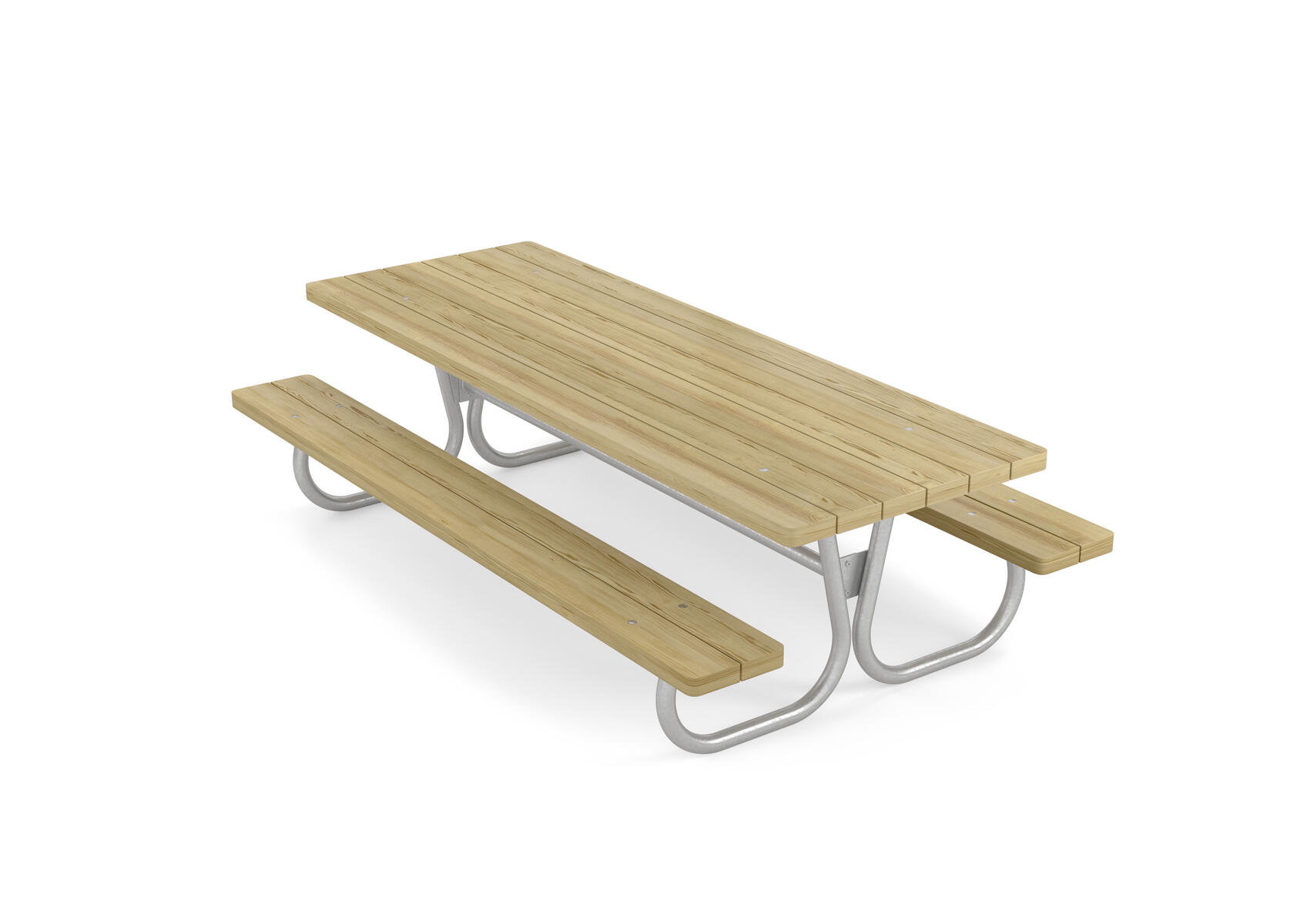 Stålytorna på bänkarna går att få lackerade i fyra olika färger eller enbart förzinkat, de lackerade stålytorna är först förzinkade. Bordsskiva i oljad furu.