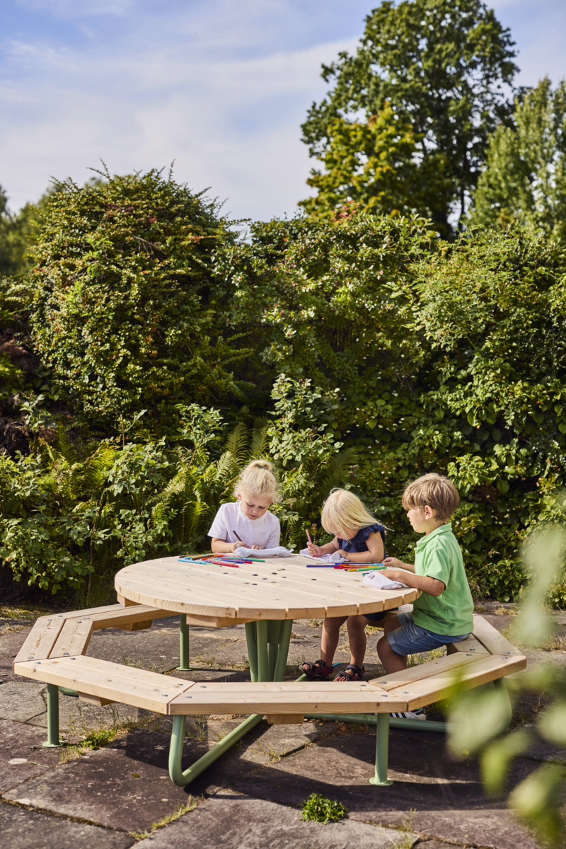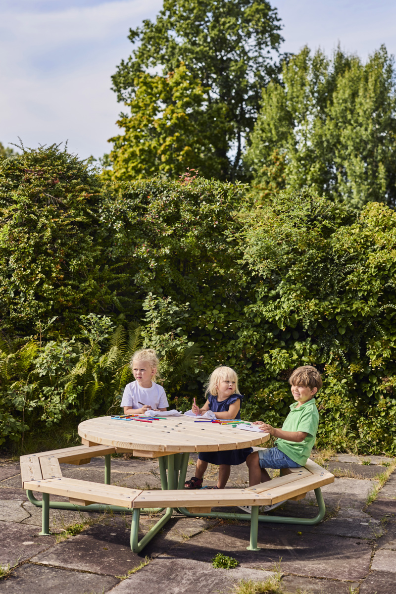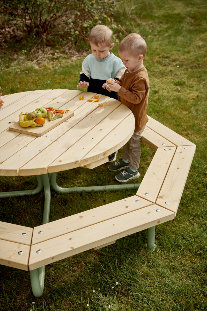 Stort och stabilt med fasta bänkar. Sitt- och bordshöjd anpassade för barnen. Levereras omonterat. Mått: L: 230 cm, sitthöjd: 32 cm. Bordsskivans bredd: 70,8 cm. Höjd mellan sits och bord är 23 cm. Förzinkat underrede. Bordsskiva och bänkar i oljad furu. Vi rekommenderar behandling med vattenbaserad träolja innan användning utomhus. Upprepa behandlingen vid behov.