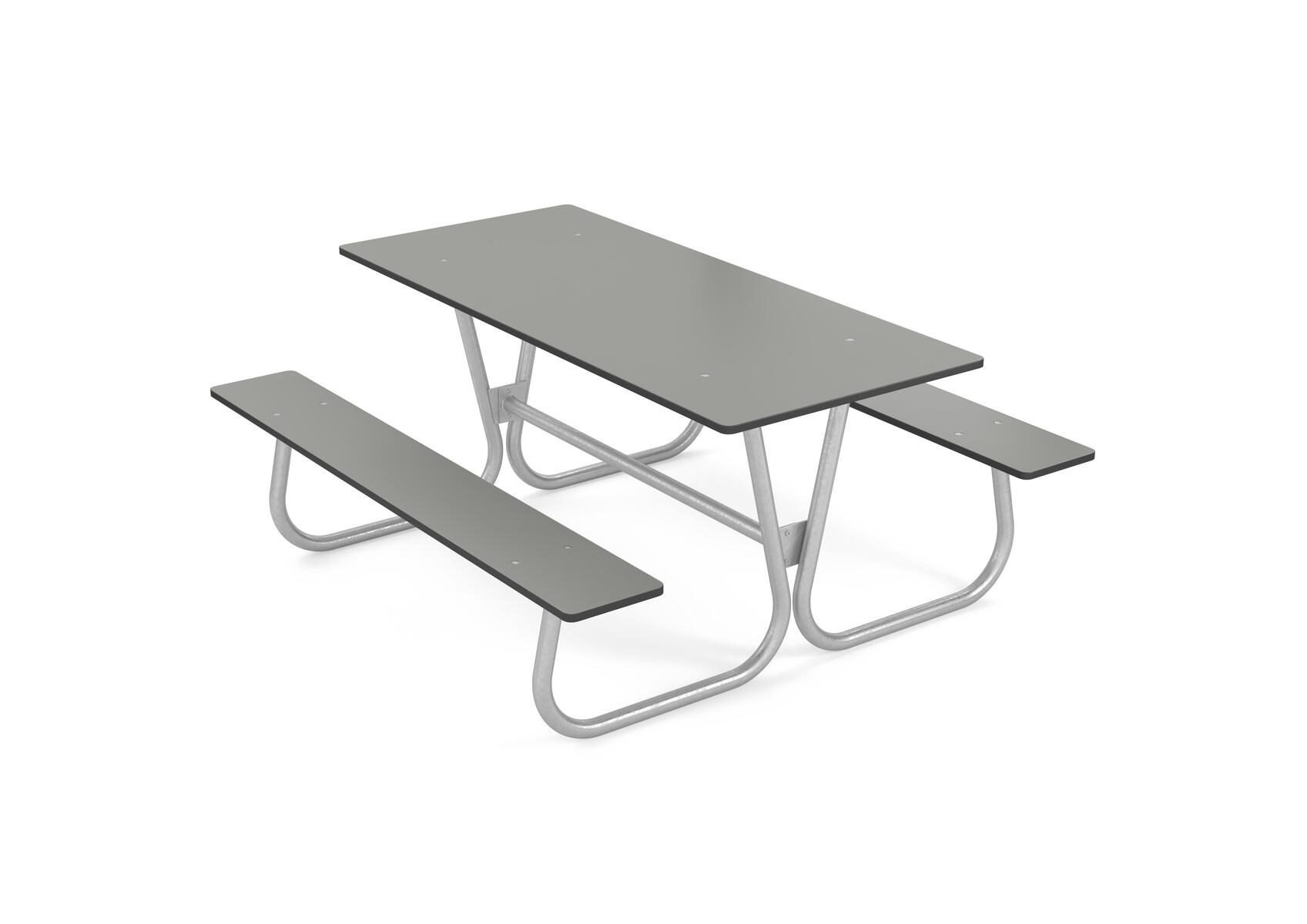 Stålytorna på bänkarna är förzinkade. Bordsskiva av kompaktlaminat.