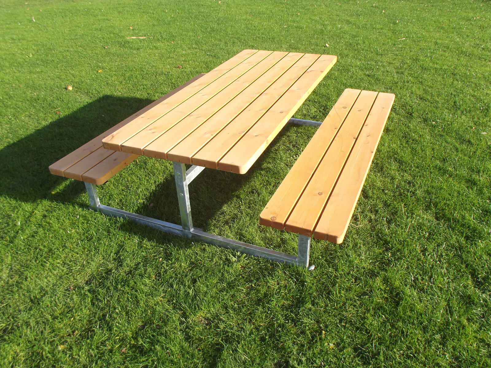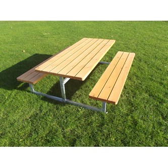 Picknickbord Junior utan rygg i massiv, skandinavisk norrlandsfuru med stabilt, galvaniserat stålunderrede. Bordet är förberett för fast installation i marken. Träet är behandlat för utomhusmiljö. Mått: L180xB160 cm.