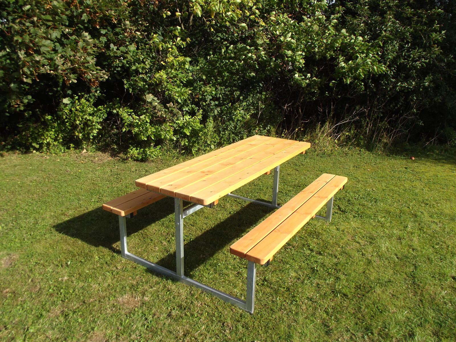 Stort och stabilt med fasta bänkar. Levereras omonterat. Mått: L: 230 cm, sitthöjd 44 cm. Bordsskivans bredd 70,8 cm. Förzinkat underrede. Bordsskiva och bänkar i oljad furu. Vi rekommenderar behandling med vattenbaserad träolja innan användning utomhus. Upprepa behandlingen vid behov.