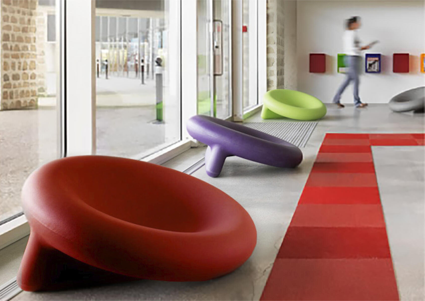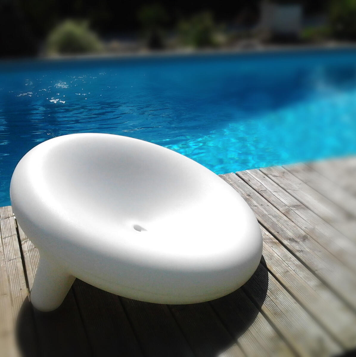 Sittplats för en vuxen eller två små barn, med ett starkt och annorlunda visuellt uttryck. Formen är enkel med god sittkomfort trots låg höjd. Flera färger att välja mellan. Kan enkelt flyttas när en sittplats behövs. Högkvalitativt material och finish. Ett litet dräneringshål i sitsen där regnvatten kan rinna ut. Konstruerad för utomhusbruk men kan även användas inomhus. Mått: ø 97 cm. Höjd: fram 18, bak 40 cm.