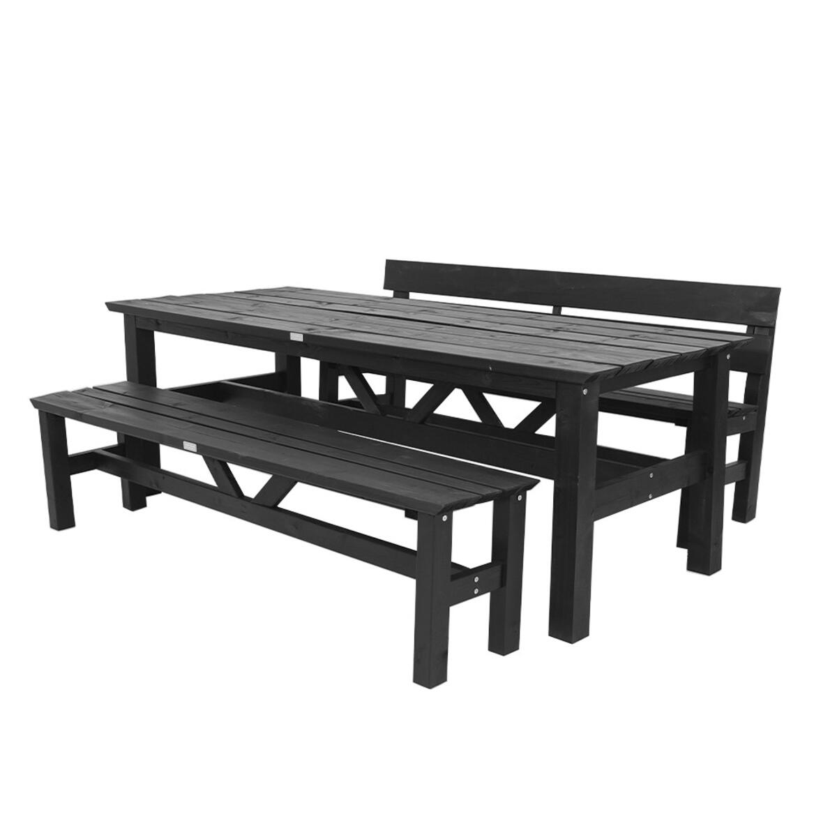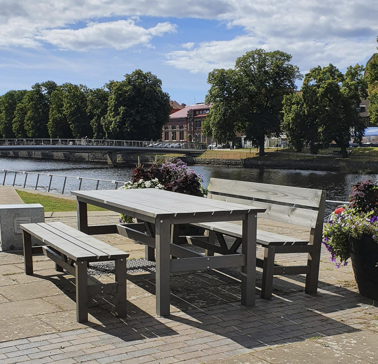 En rejäl matgrupp helt i trä som inbjuder till möten och gemenskap i utemiljön. Matgruppen består av 1 bord, samt flyttbara bänkar 1 bänk med ryggstöd och en bänk utan ryggstöd. Viking grupp tillverkas i FSC ®-märkt norrländsk furu, 33 mm. Mått på bord 90×220 cm, och bänkarna är 190 cm långa.