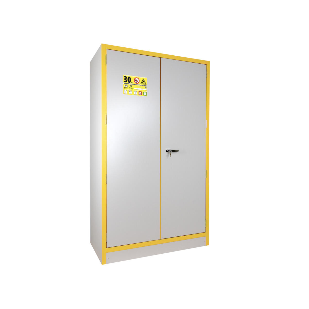 Brandklassat kemikalieskåp F30 för förvaring av brandfarliga och giftiga kemikalier. Skåpet levereras med hantagslås med två nycklar (monterat vid leverans). 3 flyttbara hyllplan samt 1 bottentråg med perforerad bottenplatta. Uppsamlingsvolym: 41 l. Hyllkapacitet: 50 kg jämn belastning. Försett med ventilationsstos i tak (ø 100 mm) för inluft och anslutning till frånluft. Inv. mått: H158,1xB100,1xD41,9 cm. Skåpet är utrustat med självstängande dörrar som är uppställningsbara men som stängs automatiskt vid en temperaturstegring på mer än 50° i rummet. Skåpet är avsett för förvaring av större mängder brandfarlig vara med flampunkt 30 °C eller lägre i brandcellen eller när skåpet placeras i känslig miljö. Testat enligt EN 16121:2013 samt EN 14470-1.