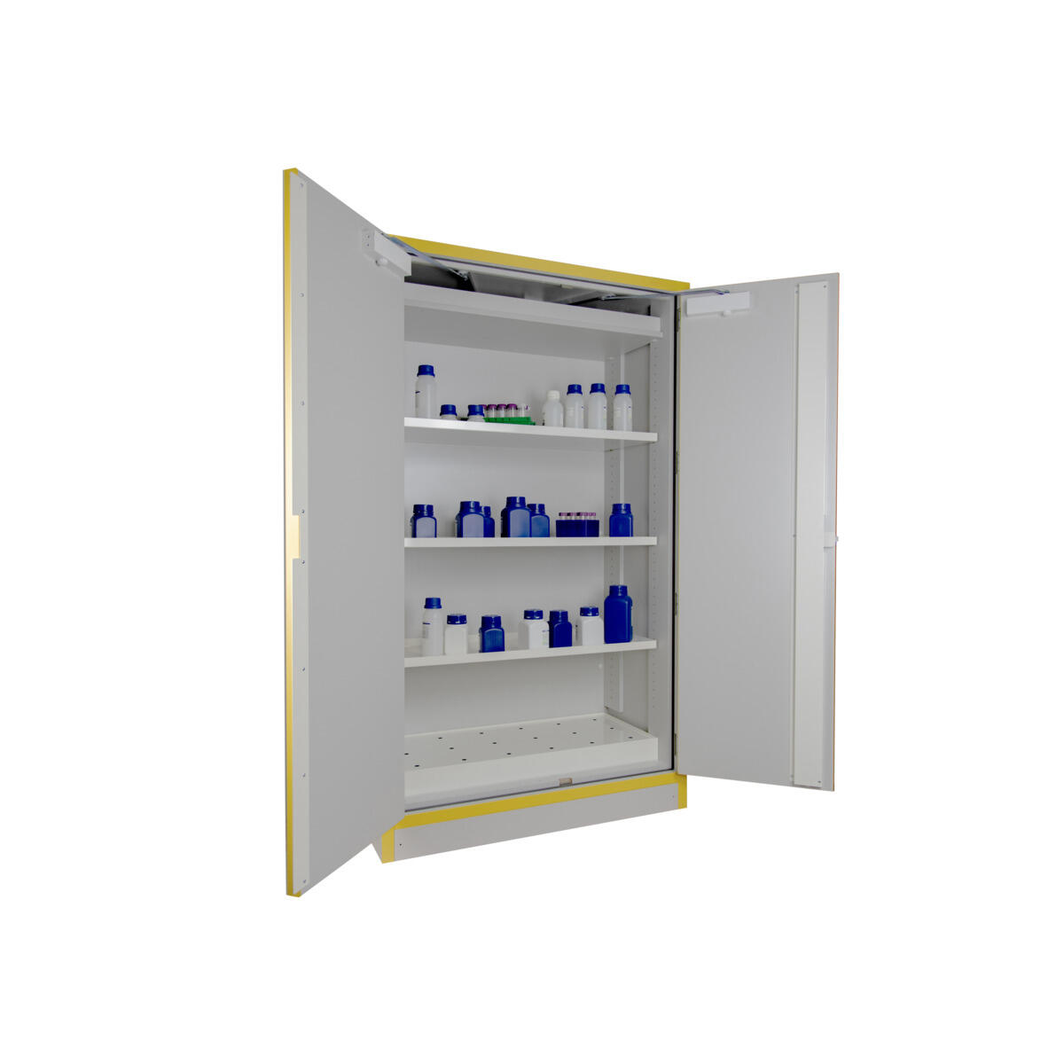 Brandklassat kemikalieskåp F30 med glasdörrar för förvaring av brandfarliga och giftiga kemikalier. Skåpet levereras med hantagslås med två nycklar (monterat vid leverans). 3 flyttbara hyllplan samt 1 bottentråg med perforerad bottenplatta. Uppsamlingsvolym: 20 l. Hyllkapacitet: 50 kg jämn belastning. Försett med ventilationsstos i tak (ø 100 mm) för inluft och anslutning till frånluft. Inv. mått: H158,1xB49,1xD41,9 cm. Skåpet är utrustat med självstängande dörr som är uppställningsbar men som stängs automatiskt vid en temperaturstegring på mer än 50° i rummet. Skåpet är avsett för förvaring av större mängder brandfarlig vara med flampunkt 30 °C eller lägre i brandcellen eller när skåpet placeras i känslig miljö. Testat enligt EN 16121:2013 samt EN 14470-1.