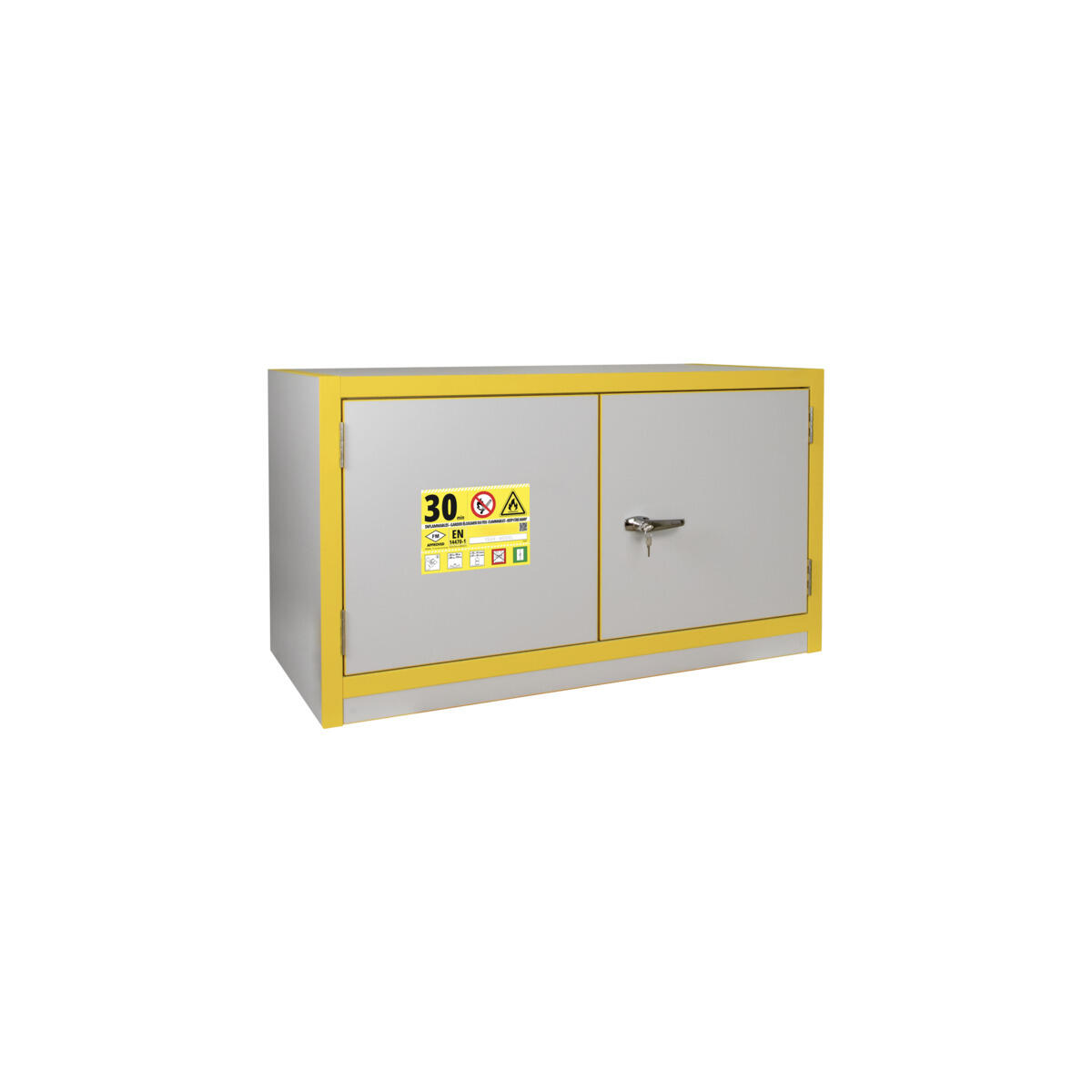 Brandklassat kemikalieskåp F30 för förvaring av brandfarliga och giftiga kemikalier. Skåpet levereras med hantagslås med två nycklar (monterat vid leverans). 1 bottentråg med perforerad bottenplatta. Uppsamlingsvolym: 41 l. Hyllkapacitet: 50 kg jämn belastning. Försett med ventilationsstos i rygg (ø 100 mm) för inluft och anslutning till frånluft. Inv. mått: H36,6xB100,1xD41,9 cm. Skåpet är utrustat med självstängande dörrar som är uppställningsbara men som stängs automatiskt vid en temperaturstegring på mer än 50° i rummet. Skåpet är avsett för förvaring av större mängder brandfarlig vara med flampunkt 30 °C eller lägre i brandcellen eller när skåpet placeras i känslig miljö. Testat enligt EN 16121:2013 samt EN 14470-1.