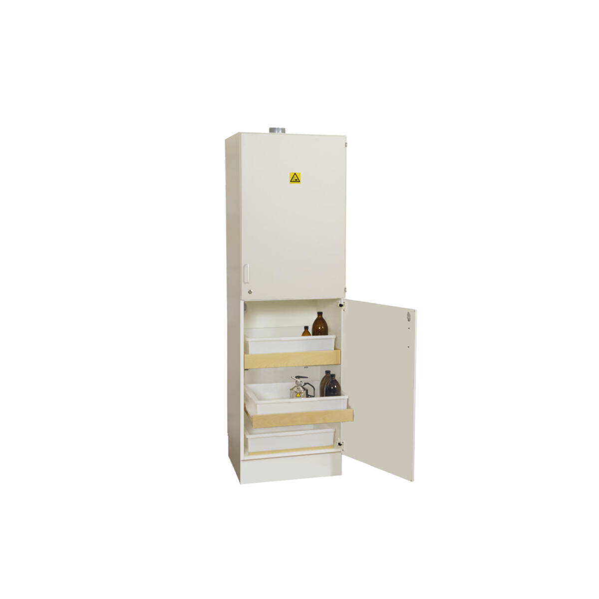 Ventilerat syra- och basskåp uppdelat i två sektioner för att förvara syror och baser åtskiljda. Skåpet är tillverkat i högtryckslaminat. 6 hyllplan varav 4 är utdragbara, 6 lådor i polypropylen (18 liter). Lådorna går att lyfta ur skåpet. Hyllkapacitet: 50 kg jämn belastning. Ventilationskanal i rygg och anslutningsstos i tak (ø 100 mm). Skåpet levereras med ASSA‑cylinderlås med två nycklar (monterat vi leverans). OBS! Frätande ämnen skall placeras under ögonhöjd. Skåpet är testat enligt EN 16121:2013.