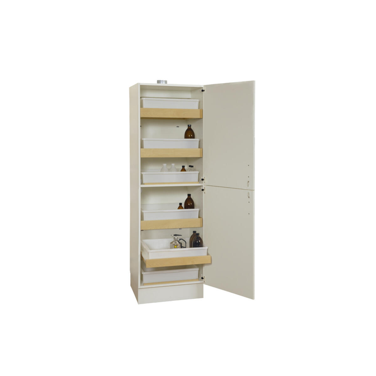 Ventilerat syra- och basskåp med glasdörrar uppdelat i två sektioner för att förvara syror och baser åtskiljda. Skåpet är tillverkat i högtryckslaminat. 6 hyllplan varav 4 är utdragbara, 6 lådor i polypropylen (18 liter). Lådorna går att lyfta ur skåpet. Hyllkapacitet: 50 kg jämn belastning. Ventilationskanal i rygg och anslutningsstos i tak (ø 100 mm). Skåpet levereras med ASSA‑cylinderlås med två nycklar (monterat vi leverans). OBS! Frätande ämnen skall placeras under ögonhöjd. Skåpet är testat enligt EN 16121:2013.