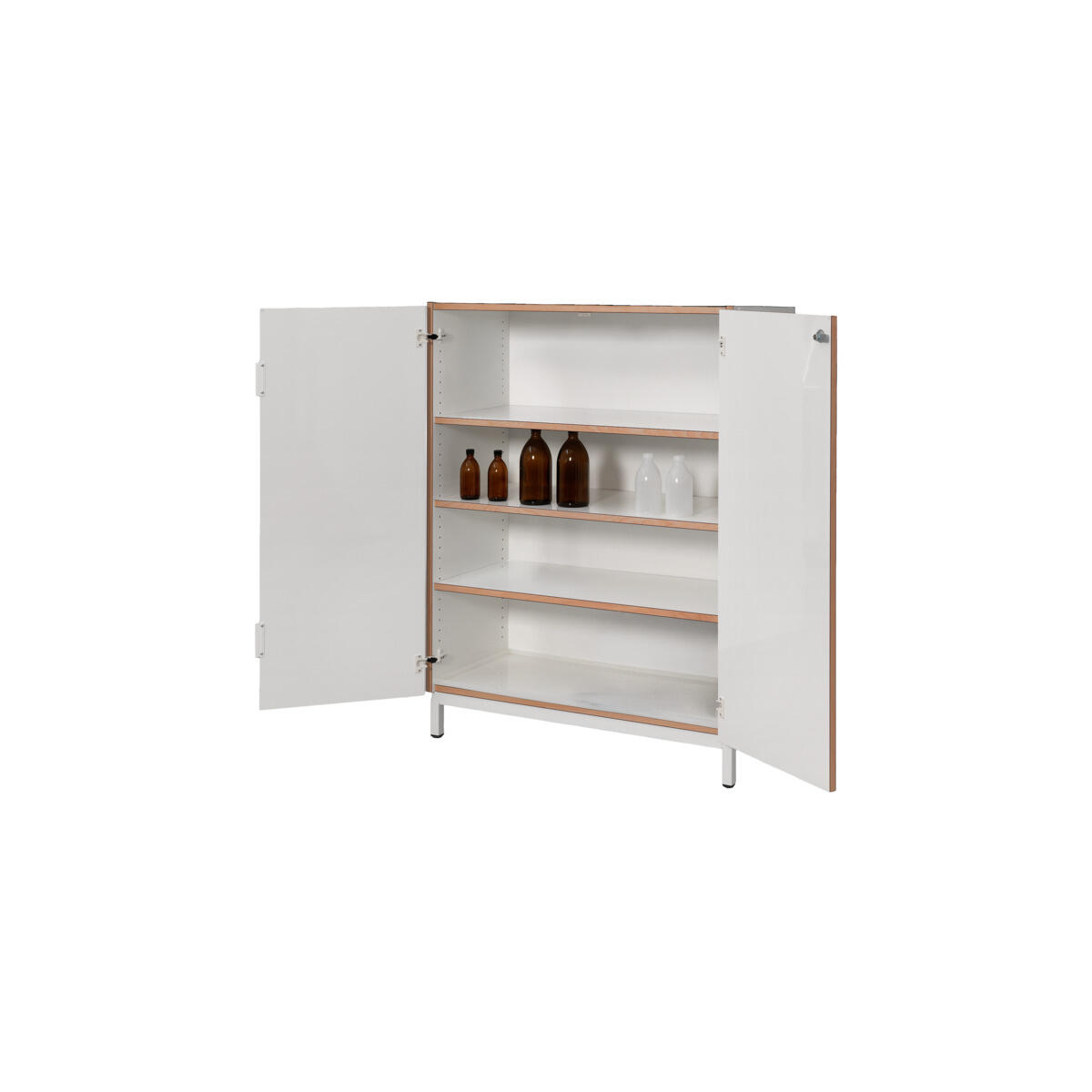 Ventilerat syra- och basskåp uppdelat i två sektioner för att förvara syror och baser åtskiljda. Skåpet är tillverkat i högtryckslaminat. 6 hyllplan varav 4 är utdragbara, 6 lådor i polypropylen (18 liter). Lådorna går att lyfta ur skåpet. Hyllkapacitet: 50 kg jämn belastning. Ventilationskanal i rygg och anslutningsstos i tak (ø 100 mm). Skåpet levereras med ASSA‑cylinderlås med två nycklar (monterat vi leverans). OBS! Frätande ämnen skall placeras under ögonhöjd. Skåpet är testat enligt EN 16121:2013.