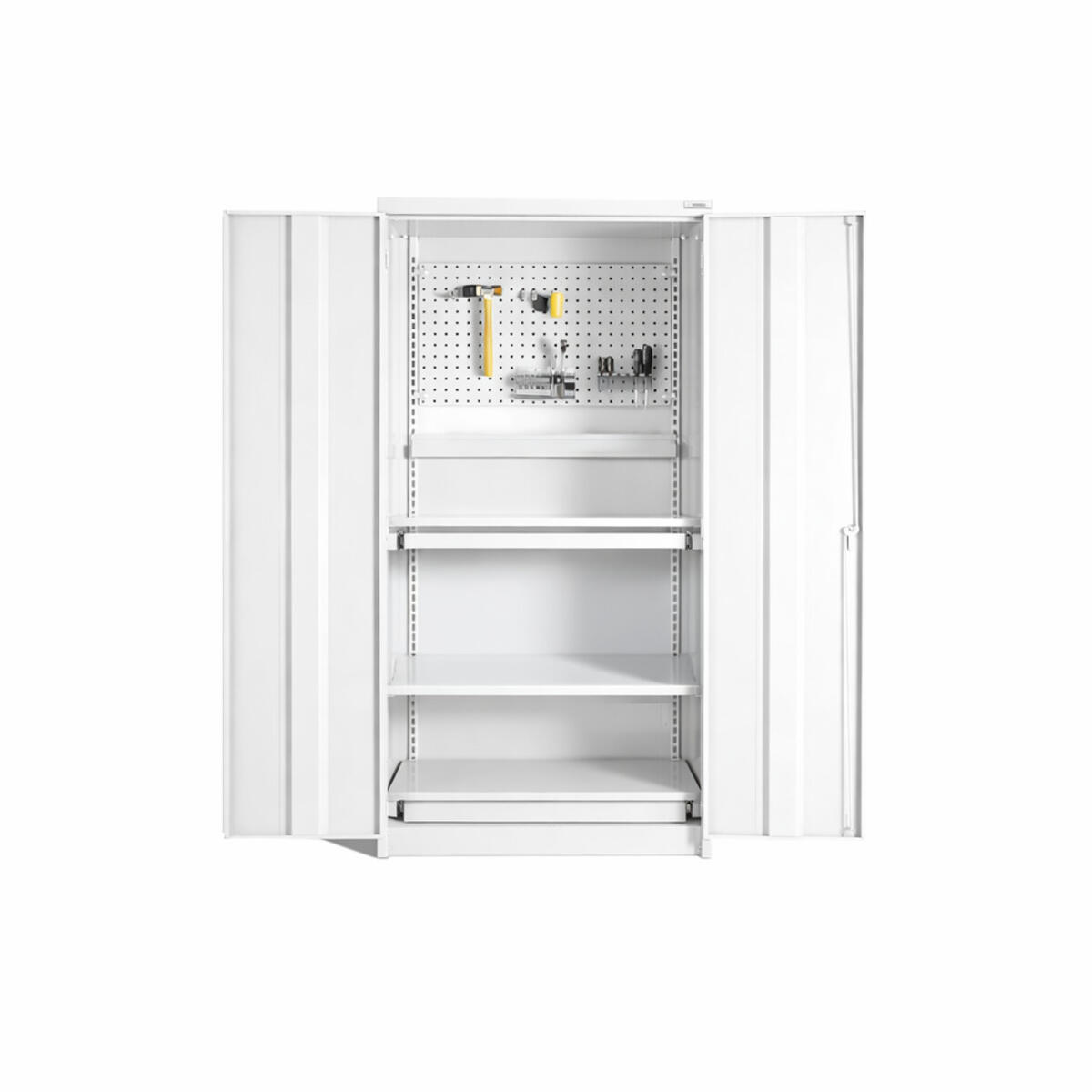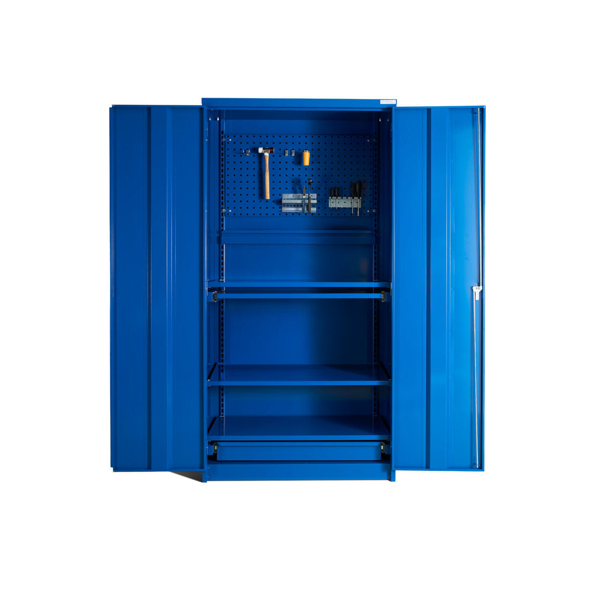 Verkstadsskåp tillverkat av kraftig stålplåt som klarar tung belastning. Skåpet levereras med kraftig espanjolettlåsning och handtagslås med två nycklar (ej monterat vid leverans). Inredning: 1 verktygspanel, 3 flyttbara hyllplan, 1 utdragbar hylla, 1 utdragbar låda samt 1 upphängningsli för plastbackar. Hyllkapacitet: 100 kg jämn belastning. Inv. mått: H183,5xB95xD47 cm. Skåpet är testat enligt EN 14073-2 samt EN 14074:2004.