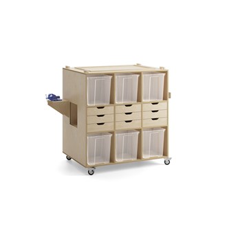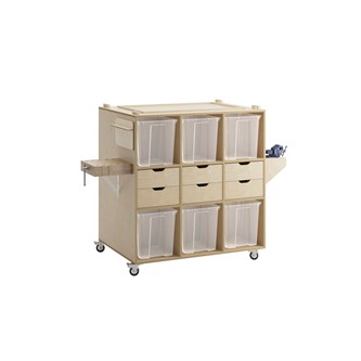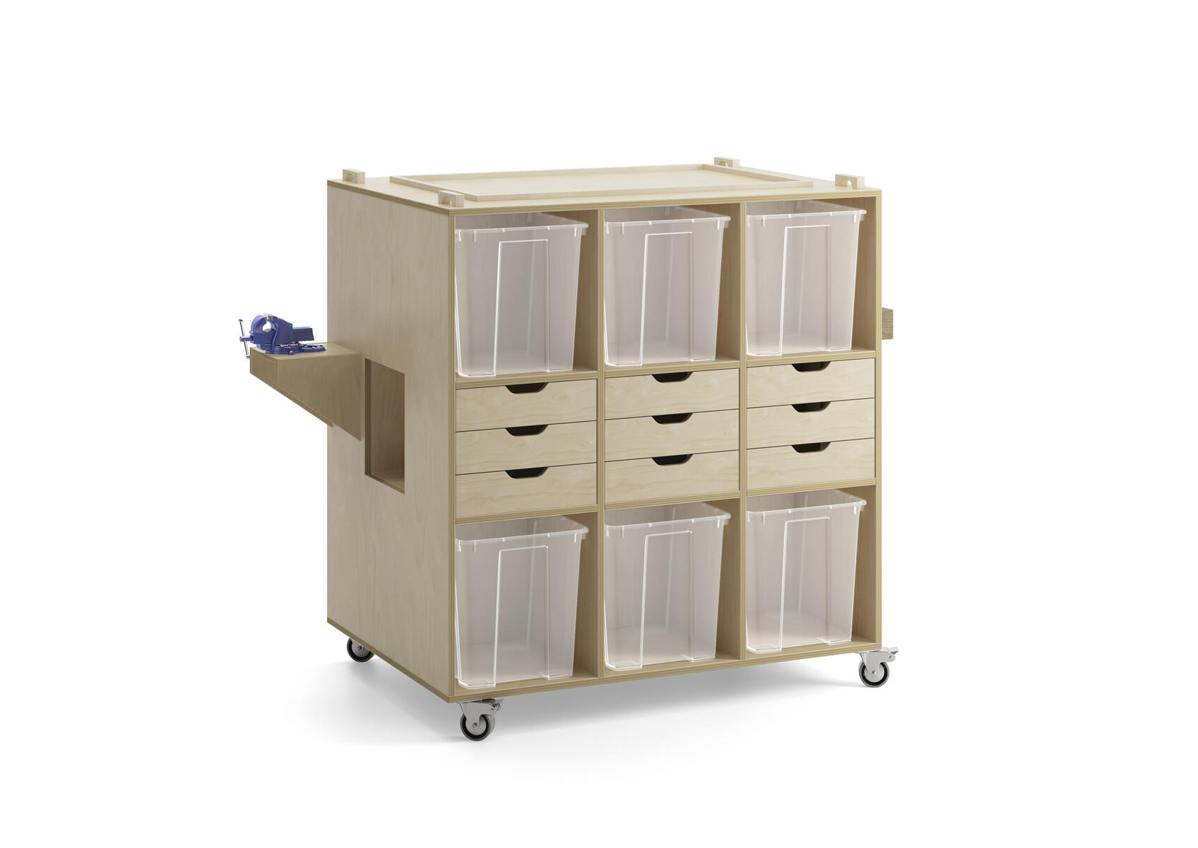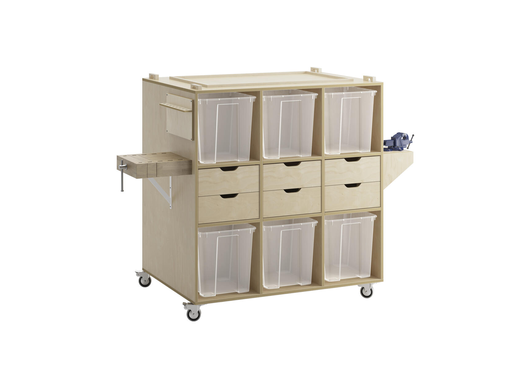 Mobil förvaringslösning anpassad för skapande arbete i skolan, t.ex. i ett makerspace. Utrustad med lådor och backar för förvaring av saxar, papper, lim, pennor och allt annat som behövs för att vara kreativ. Levereras med hyvelbänk och verktygsförvaring, samt skruvtving och förvaringsplats för långt material. Tillverkad av 18 mm björkkryssfaner. Bredd inkl. skruvstäd: 181 cm. 12 stora plastbackar H30 cm, 9 trälådor H9 cm och 6 trälådor H13 cm ingår.