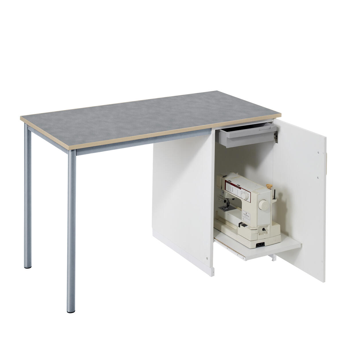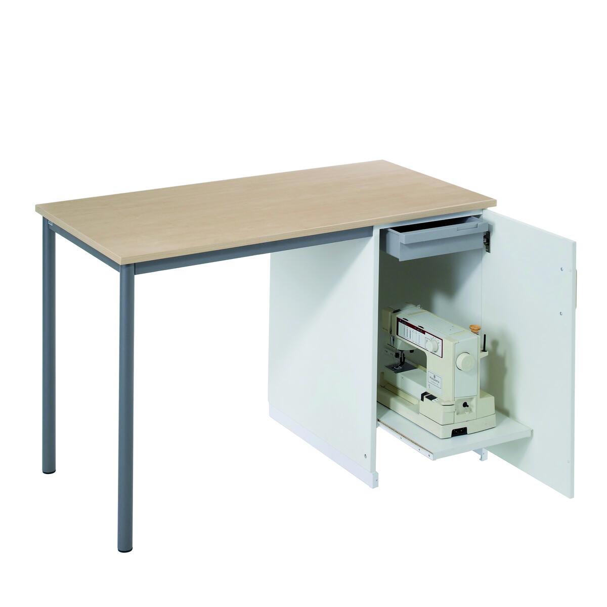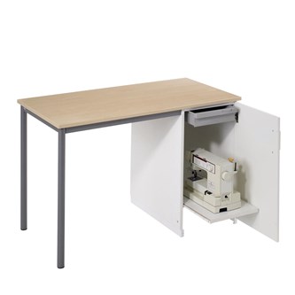 Utdragbar hylla samt plastlåda upptill. Mått: 120x60x80 cm. Skiva i antracitgrå linoleum eller björkfärgat högtryckslaminat. Stativfärg silver RAL9006. Innermått låda: B23xD34xH7 cm