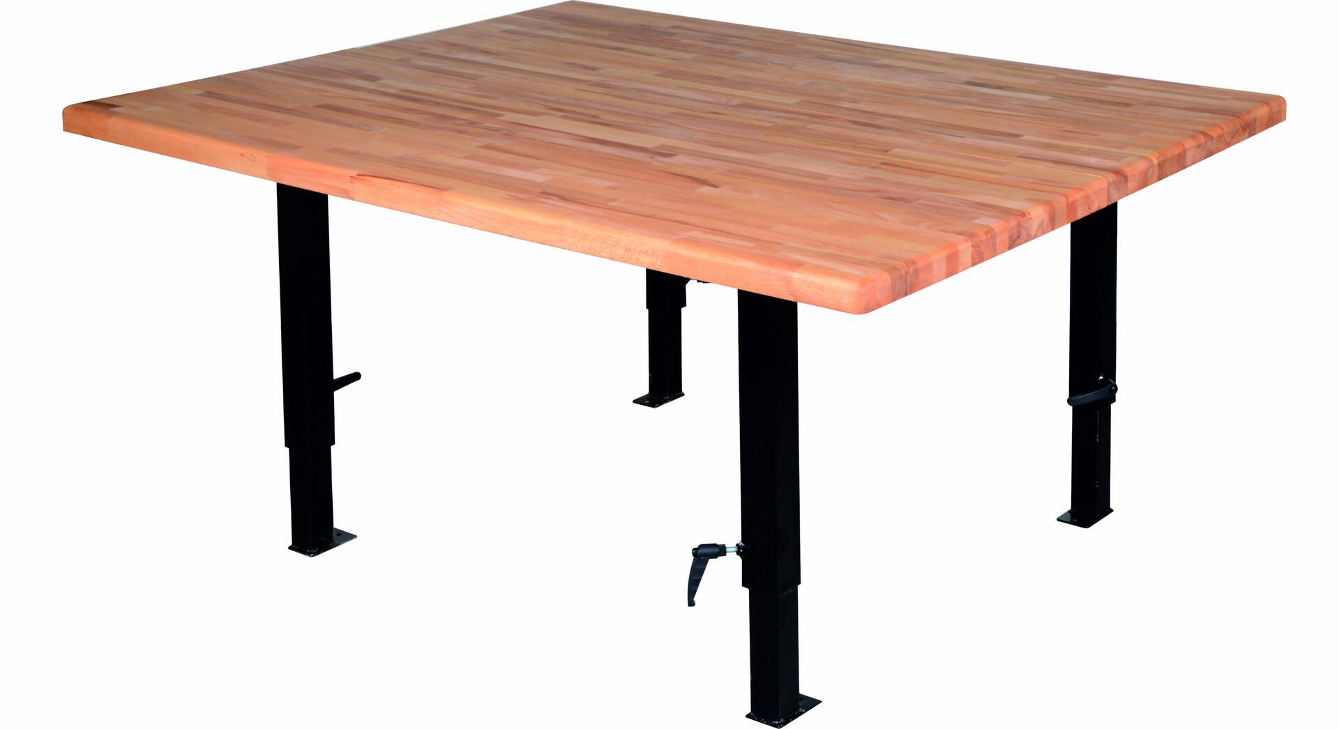 Robust arbetsbänk med 4 arbetsplatser, främst utformad för användning i skolor. Varje arbetsstation är utrustad med stålgjuten bak- och framtång. Bänkskiva av massivt, 8 cm bokblock. Höj- och sänkbara ben med gasdämpare. Höjdjustering kräver 2 personer. Bänkytor är linoljade. 4 par bänkhakar ø 19 mm ingår. Mått bänkskiva exkl. tång: 145x145 cm. Kraftigt skruvstäd (german type).