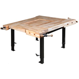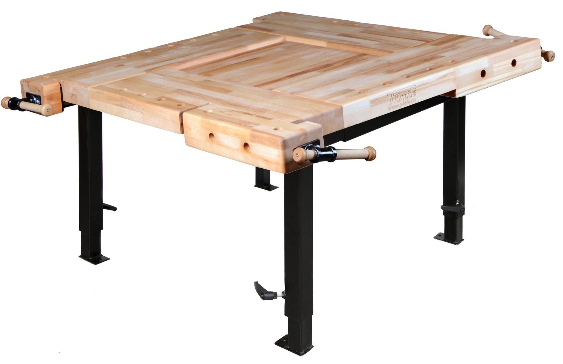 Robust arbetsbänk med 4 arbetsplatser, främst utformad för användning i skolor. Varje arbetsstation är utrustad med stålgjuten bak- och framtång. Bänkskiva av massivt, 8 cm bokblock. Höj- och sänkbara ben med gasdämpare. Höjdjustering kräver 2 personer. Bänkytor är linoljade. 4 par bänkhakar ø 19 mm ingår. Mått bänkskiva exkl. tång: 145x145 cm. Kraftigt skruvstäd (german type).