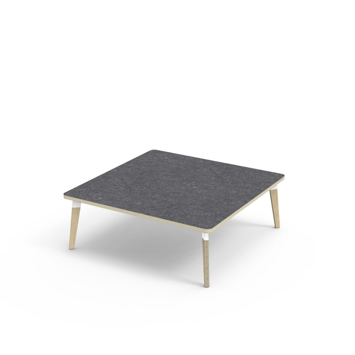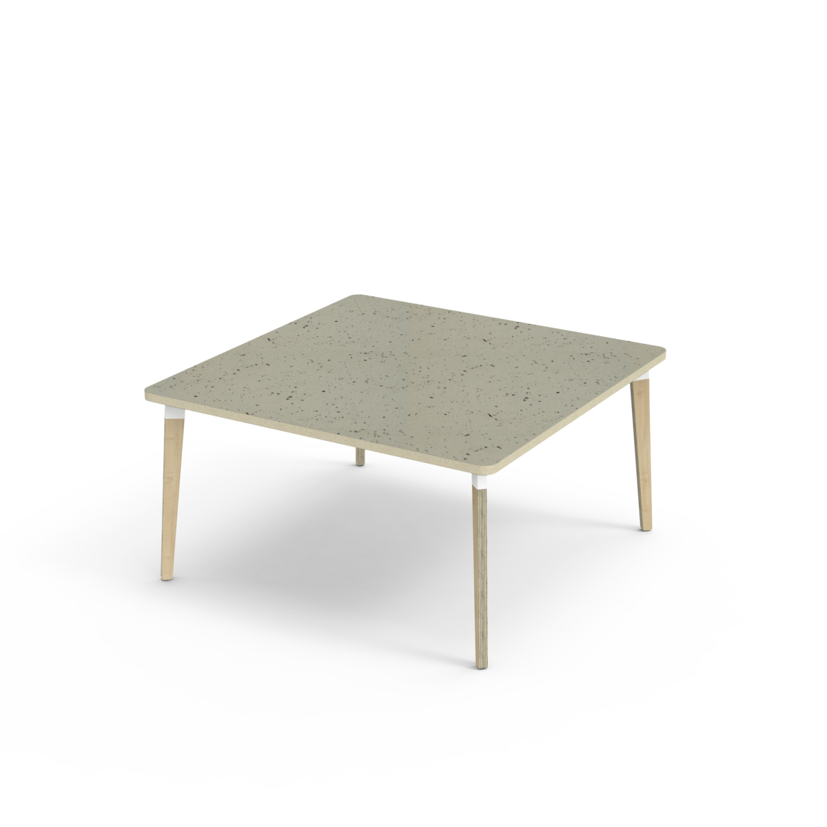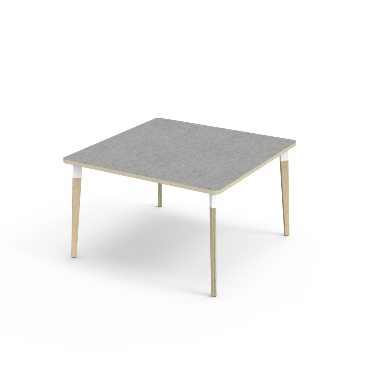 Bordsskiva belagd med akustik linoleum, vilket ger en mjuk och behaglig yta samtidigt som det bidrar till en bättre ljudmiljö. Med en hörnradie på 40 mm får bordet en modern och stilren design. Benen har en rektangulär form och är tillverkade av klarlackad björkplywood som är monterade i en robust vit metallhylsa. Denna konstruktion garanterar både stabilitet och hållbarhet. Benen är något snett vinklade ut mot bordsskivans hörn. Monteringen är enkel och smidig – du behöver bara fästa metallhylsorna i de förberedda fästpunkterna i bordsskivan.