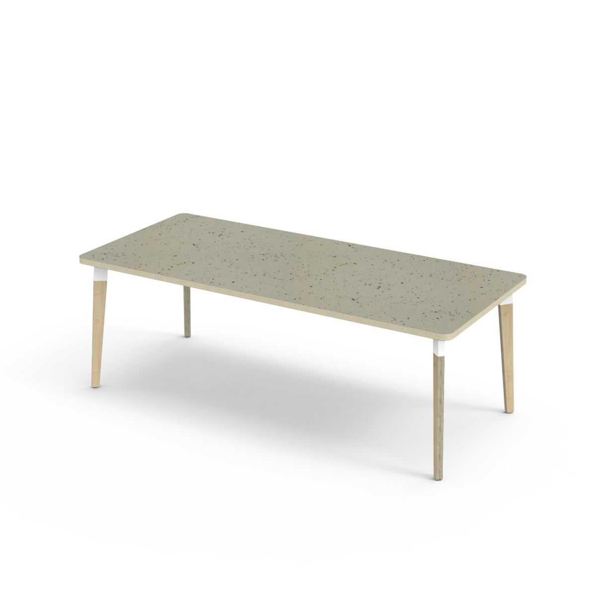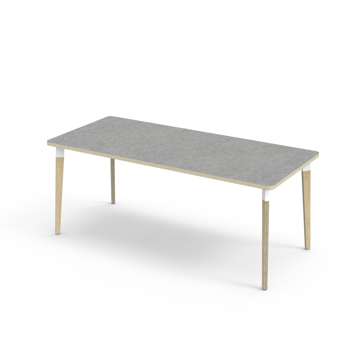 Bordsskiva belagd med akustik linoleum, vilket ger en mjuk och behaglig yta samtidigt som det bidrar till en bättre ljudmiljö. Med en hörnradie på 40 mm får bordet en modern och stilren design. Benen har en rektangulär form och är tillverkade av klarlackad björkplywood som är monterade i en robust vit metallhylsa. Denna konstruktion garanterar både stabilitet och hållbarhet. Benen är något snett vinklade ut mot bordsskivans hörn. Monteringen är enkel och smidig – du behöver bara fästa metallhylsorna i de förberedda fästpunkterna i bordsskivan.