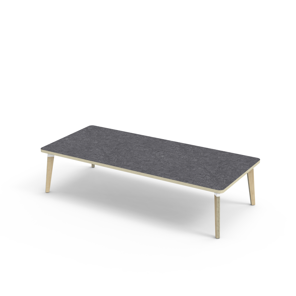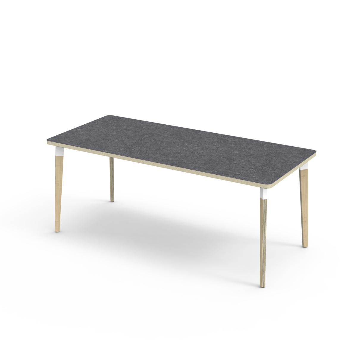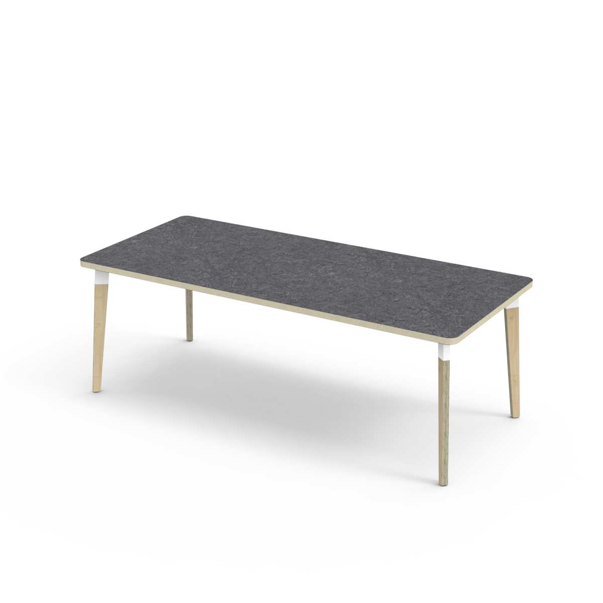 Bordsskiva belagd med akustik linoleum, vilket ger en mjuk och behaglig yta samtidigt som det bidrar till en bättre ljudmiljö. Med en hörnradie på 40 mm får bordet en modern och stilren design. Benen har en rektangulär form och är tillverkade av klarlackad björkplywood som är monterade i en robust svart metallhylsa. Denna konstruktion garanterar både stabilitet och hållbarhet. Benen är något snett vinklade ut mot bordsskivans hörn. Monteringen är enkel och smidig – du behöver bara fästa metallhylsorna i de förberedda fästpunkterna i bordsskivan.