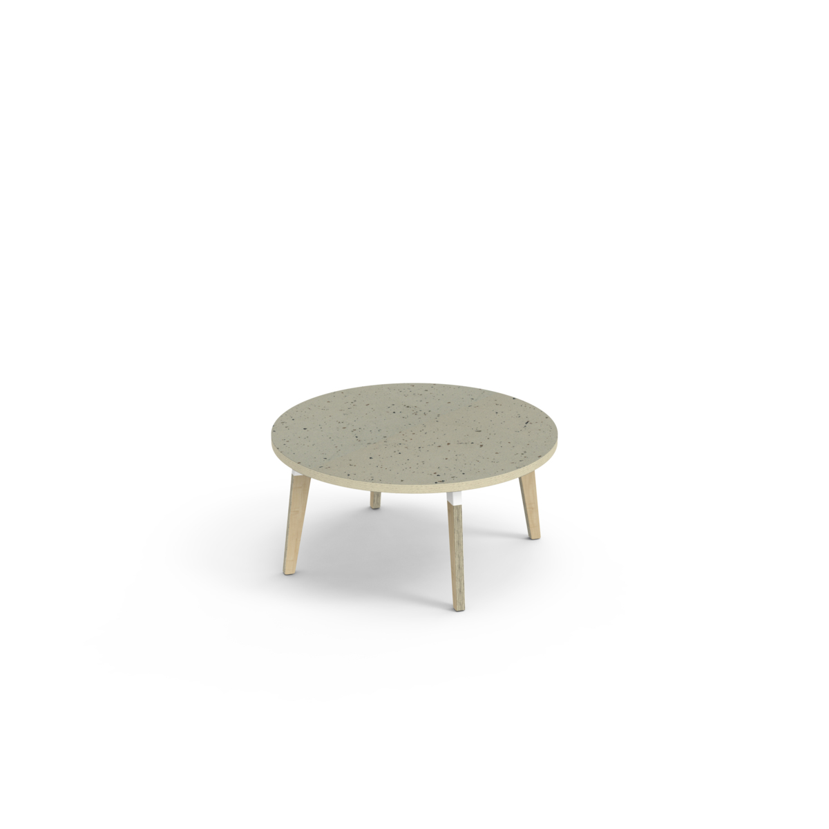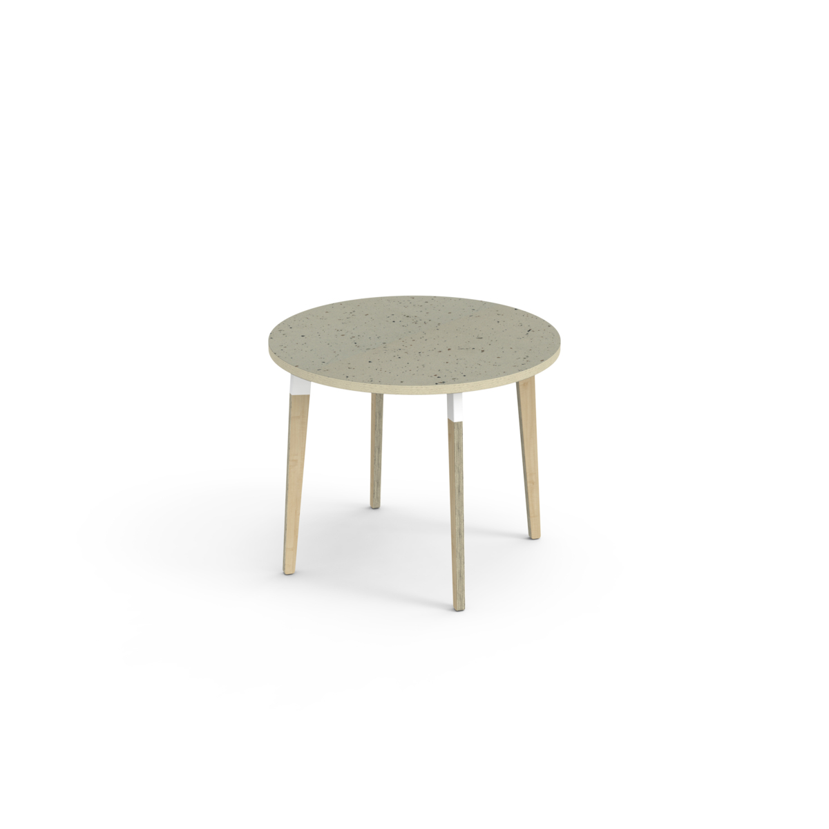 Bordsskiva belagd med akustik linoleum, vilket ger en mjuk och behaglig yta samtidigt som det bidrar till en bättre ljudmiljö. Med en hörnradie på 40 mm får bordet en modern och stilren design. Benen har en rektangulär form och är tillverkade av klarlackad björkplywood som är monterade i en robust vit metallhylsa. Denna konstruktion garanterar både stabilitet och hållbarhet. Benen är något snett vinklade ut mot bordsskivans hörn. Monteringen är enkel och smidig – du behöver bara fästa metallhylsorna i de förberedda fästpunkterna i bordsskivan.
